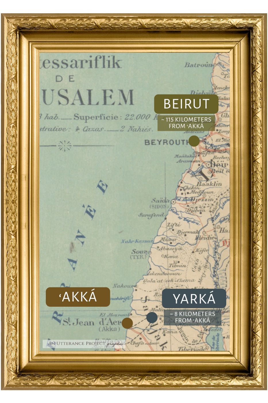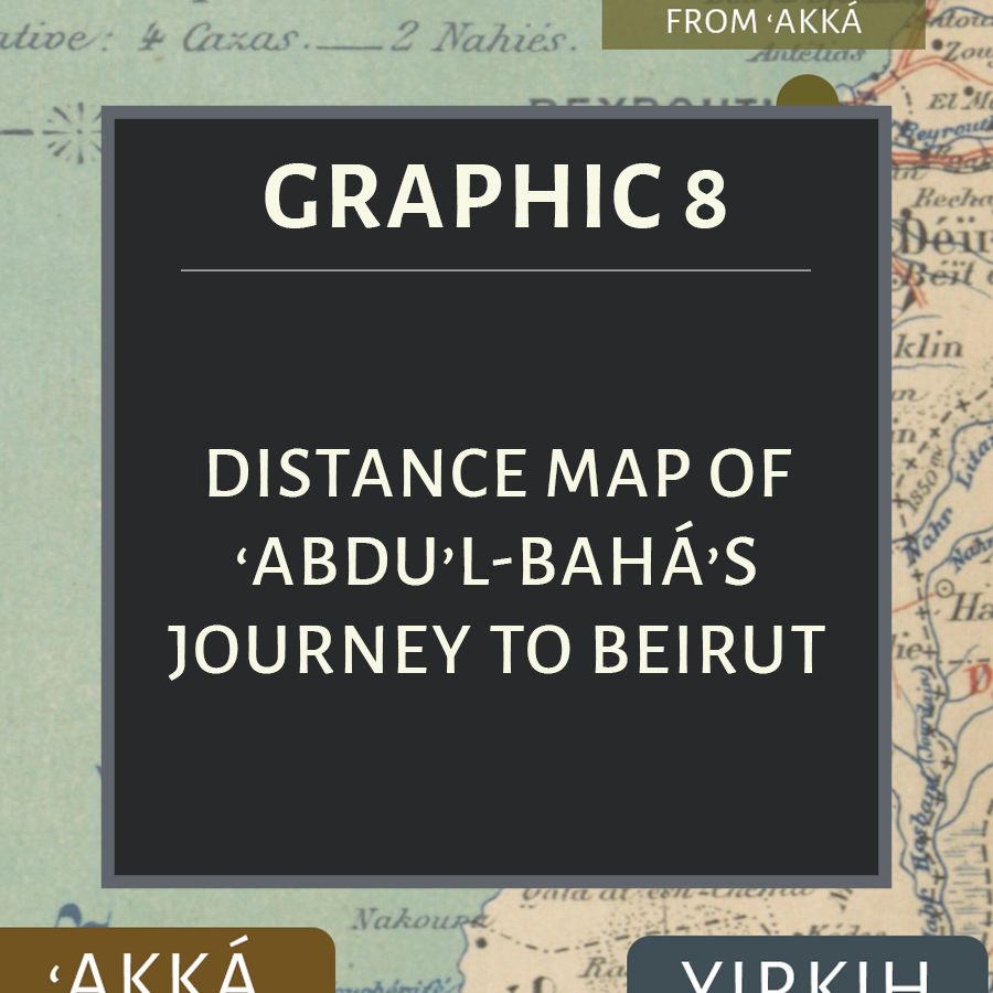 We do not have information about the journey to Beirut, but ‘Abdu’l-Bahá traveled overland back to ‘Akká. This distance map calculates the distances between the only stops we were able to find for this journey. Yirkih is the Druze Village where ‘Abdu’l-Bahá meets Bahá’u’lláh. Original graphic by Violetta Zein. 1896 Base map of “Syrie, Liban et Palestine. Géographie administrative, statistique, descriptive et raisonnée” from the British Library Collection. Wikimedia Commons.