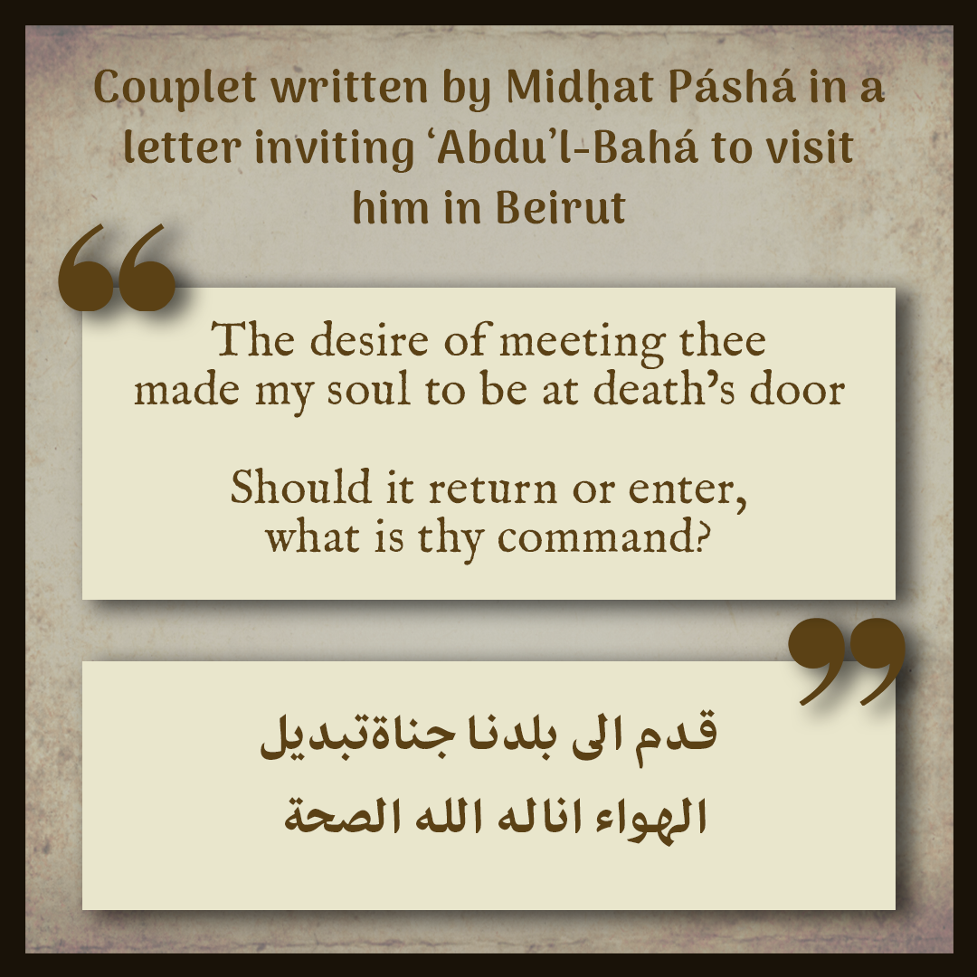 'Abdu'l-Bahá pays Midḥat Páshá a visit. The latter is so enchanted with 'Abdu'l-Bahá that he pays Him a return visit. During his two or three day stay in 'Akká, Midḥat Páshá spends most of his time humble and lowly in 'Abdu'l-Bahá's presence. As he is about to leave, he asks 'Abdu'l-Bahá to return with him to Syria and adorn Beirut with His presence, but the Master declines. Once in Beirut, Midḥat Páshá writes to 'Abdu'l-Bahá and communicates to him in a couplet, his desire to meet Him again: