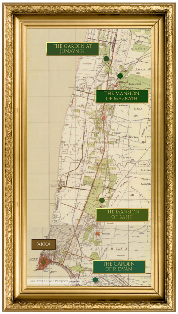 Map of the places in the ‘Akká area associated with Bahá’u’lláh and ‘Abdu’l-Bahá in the period from 1877 – 1892. Original graphic by Violetta Zein. Base map from Palestine Open Maps Website.