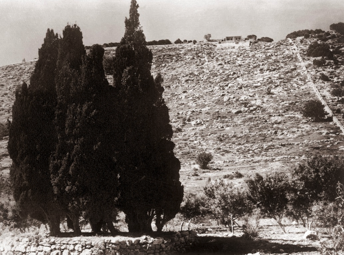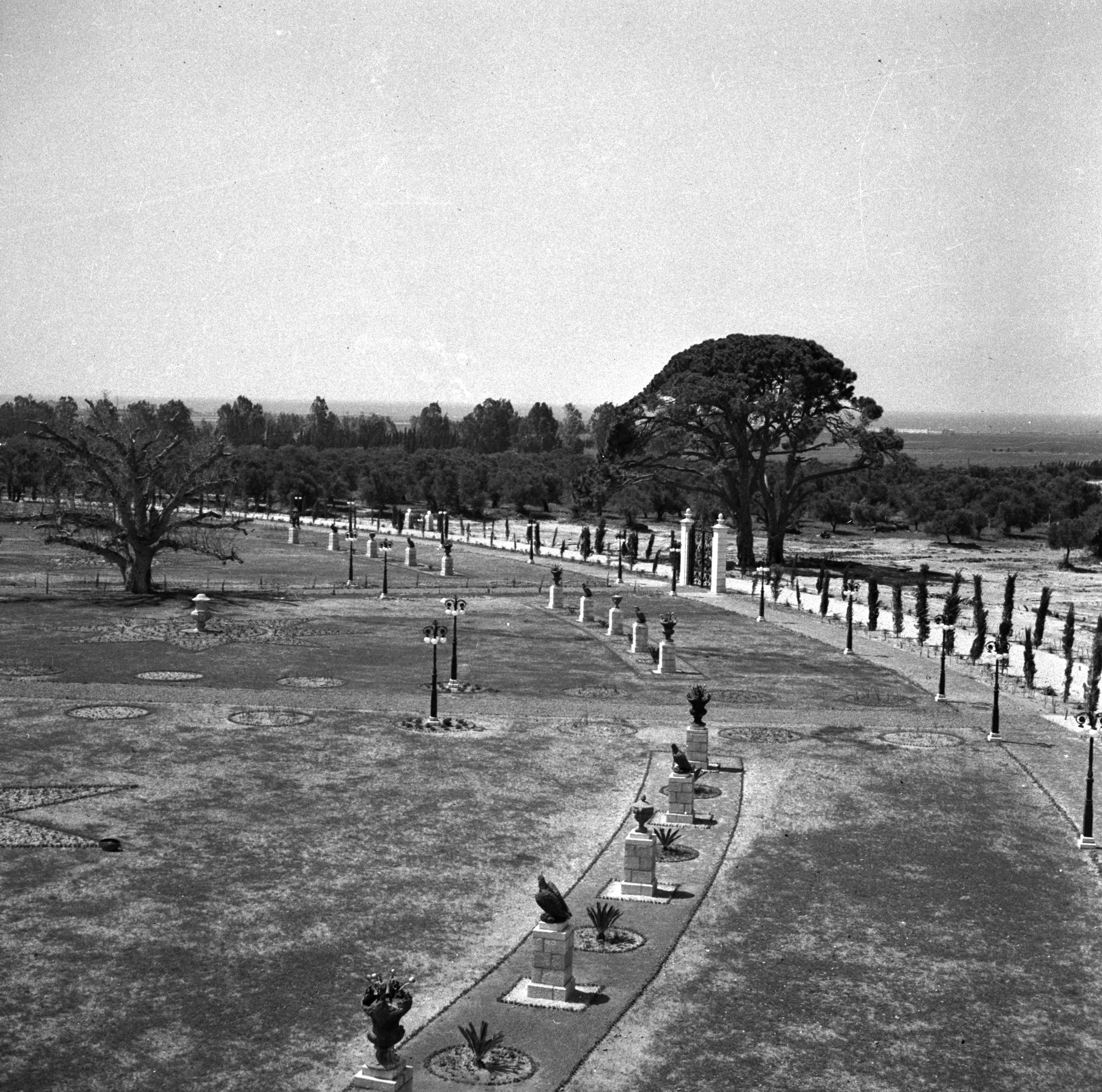 This photo shows the newly created Ḥaram-i-Aqdas garden in 1953. Shoghi Effendi converted 12,000 m2 of land (importing around 20,000m3 of soil) adjacent to the Shrine of Bahá’u’lláh into the beautiful gardens of the Ḥaram-i-Aqdas in just 2½ months. Detailed caption provided by Andrew Blake. Bahá'í Media Bank.