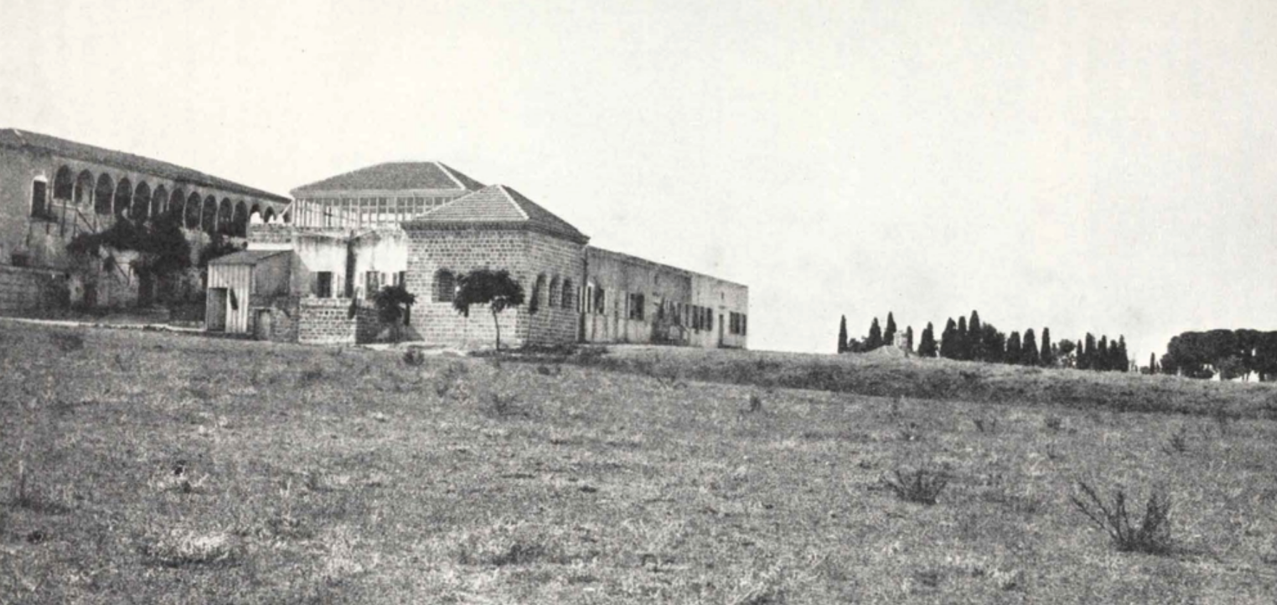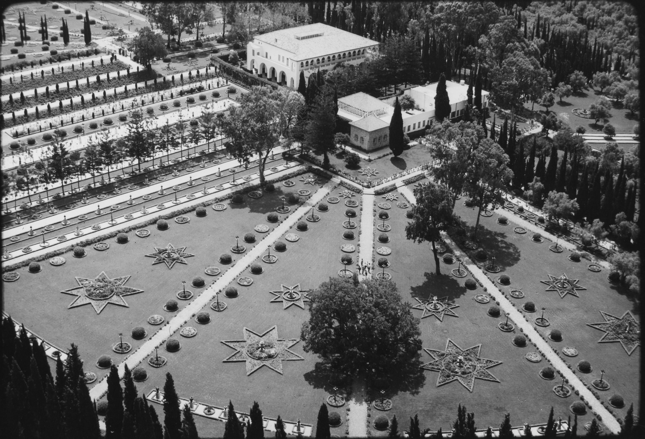 View of the Mansion of Bahjí Ttaken between 1956 – 1958 as indicated by the size of the Cypress trees (planted in 1952) and by the fact that the Covenant-breakers' house next to the Mansion has yet to be demolished (which occurred in December 1958). Detailed caption provided by Andrew Blake. Bahá'í Media Bank.
