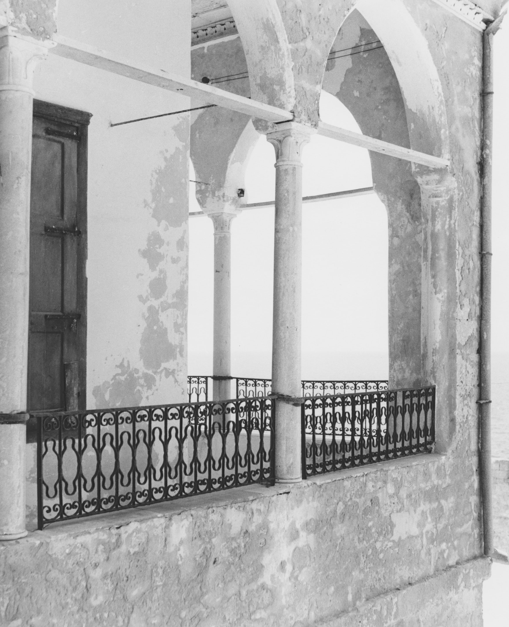 Balcony of the House of 'Abbúd, adjoining the room Bahá'u'lláh occupied. The balcony looks over the Mediterranean Sea. Photograph taken in 1952. Bahá'í Media Bank.