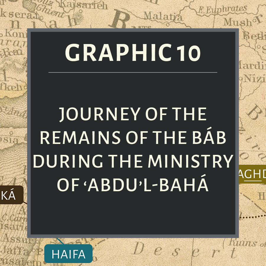 1900 – ‘Abdu’l-Bahá transfers the remains of the Báb to Haifa: Day, Michael V.. Journey To A Mountain (The Story of the Shrine of the Bab) . Kindle Edition.