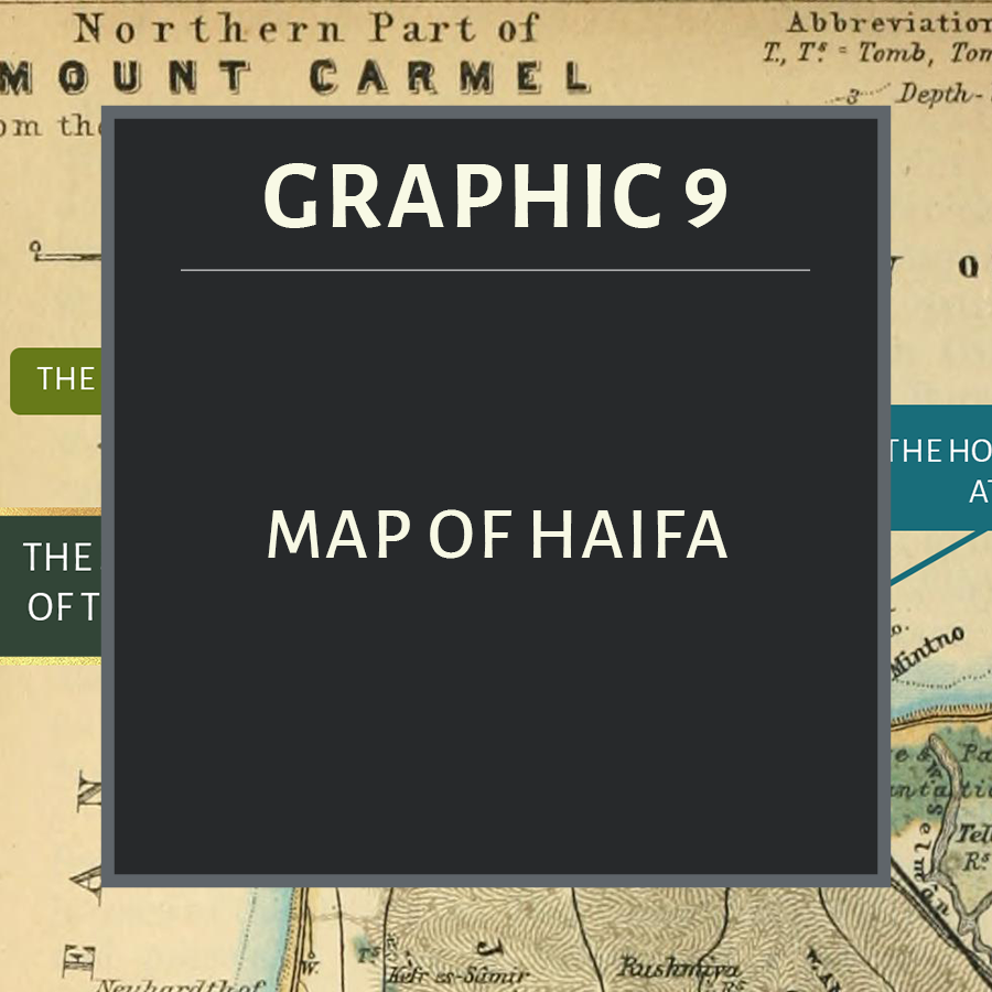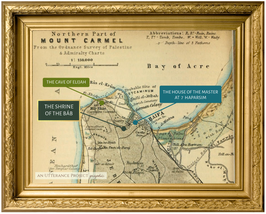 Map of the locations in Haifa associated with ‘Abdu’l-Bahá mentioned in this part of the chronology. Original graphic by Violetta Zein. Base map: 1906 map of Palestine and Syria with the chief routes through Mesopotamia and Babylonia by Karl Baedeker and others. Wikimedia Commons.
