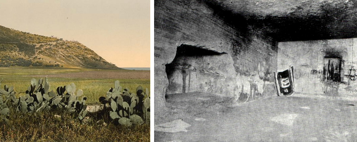 Left: A view of Mount Carmel, where the Cave of Elijah is located, photograph taken between ca. 1890 and 1900. Library of Congress. Right: The Cave of Elijah in 1893, at the time 'Abdu'l-Bahá visited it. Ventura Daniel Wiki.