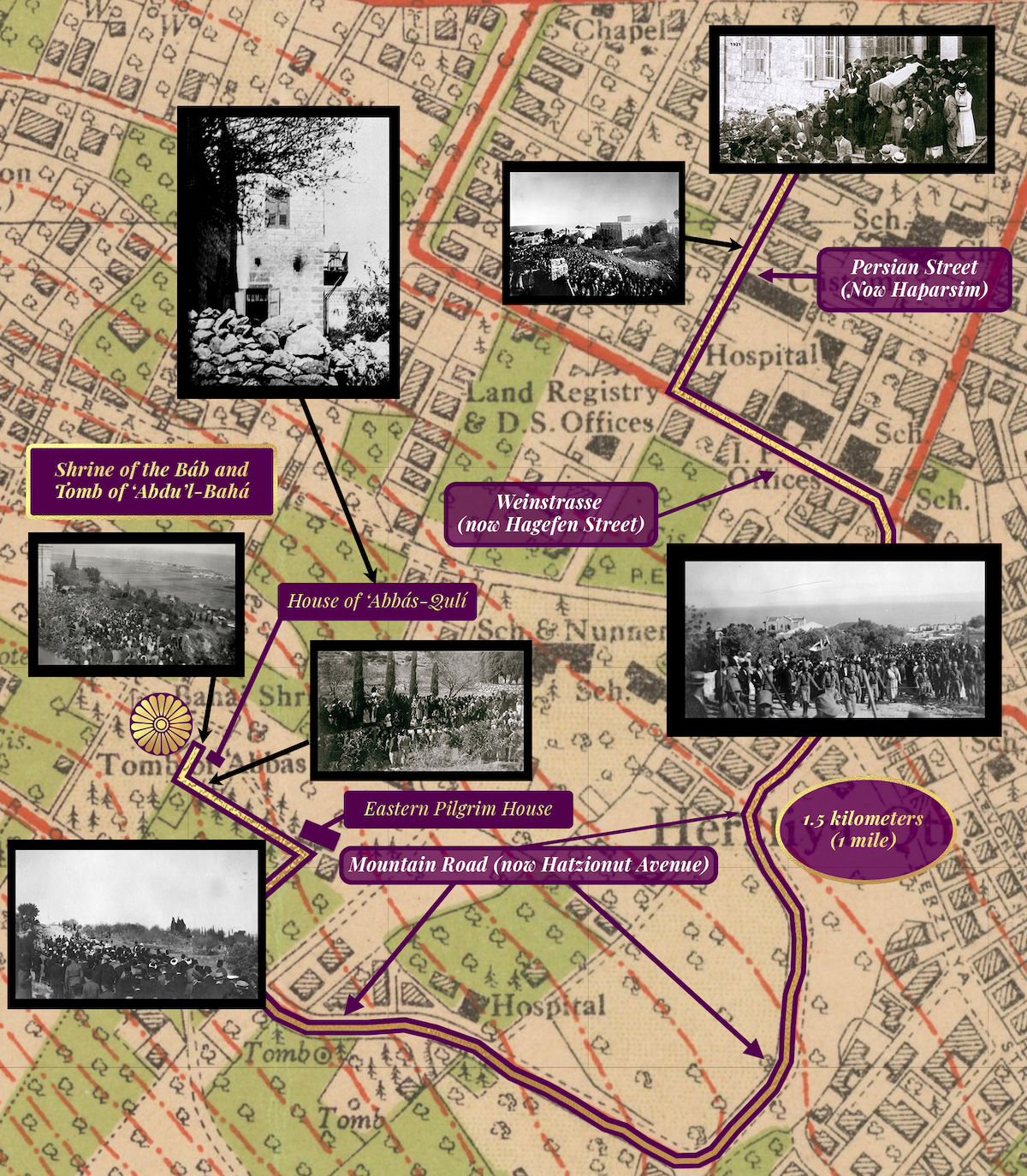 Michael collaborated with me on part IX for the very special section “The Route of ‘Abdu’l-Bahá’s Funeral Cortège.” Michael constructed the exact route of the funeral cortège from historical sources, personal accounts, and an aerial photograph for his book “Journey to a Mountain: The Story of the Shrine of the Báb Volume 1: 1850-1921”. Former member of the Universal House of Justice, the late Mr. ‘Alí Nakhjavání, confirmed with Michael an aspect of the route taken before it reached Mountain Road.