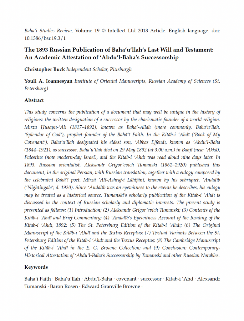 Youli co-wrote a paper with Chris Buck called “The 1893 Russian Publication of Bahá’u’lláh’s Last Will and Testament: An Academic Attestation of ‘Abdu’l-Baha’s Successorship,” which was published in Baha’i Studies Review 19 (cover date, 2013; publication date, 2017), pages 3–44. This paper goes into great detail about how Bahá’u’lláh’s Will and Testament (the Kitáb-i-‘Ahd) came to be published in a Russian Journal a year after His Ascension, which culminated into 1893 – The Russian publication of Bahá’u’lláh’s Kitáb-i-‘Ahd (Book of the Covenant) – A collaboration with Dr. Christopher Buck and Youli Ioannesyan.