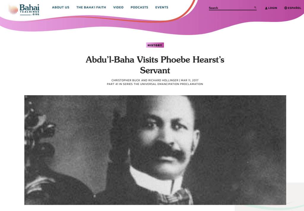 Chris also provided me with one journal article he wrote that I felt made a great “further reading” addition to the section about ‘Abdu’l-Bahá’s Howard University address because he delves deeply into the significance of this speech and ‘Abdu’l-Bahá’s purpose in visiting America. Chris also shared with me and two of his Baha’i Teachings articles, one on ‘Abdu’l-Bahá visiting Charles Henry Tinsley, and one on ‘Abdu’l-Bahá accepting Rabbi J. Leonard Levy’s invitation to speak in Pittsburgh, both of which I decided to expand into full-fledged sections of their own because the stories were so great. These sections are “10 October 1912 – ‘Abdu’l-Bahá visits Charles Henry Tinsley, a black waiter laid up with a broken leg, in his home” and 7 May 1912 -PITTSBURGH – ‘Abdu’l-Bahá speaks in Pittsburgh, at the invitation of Rabbi J. Leonard Levy.