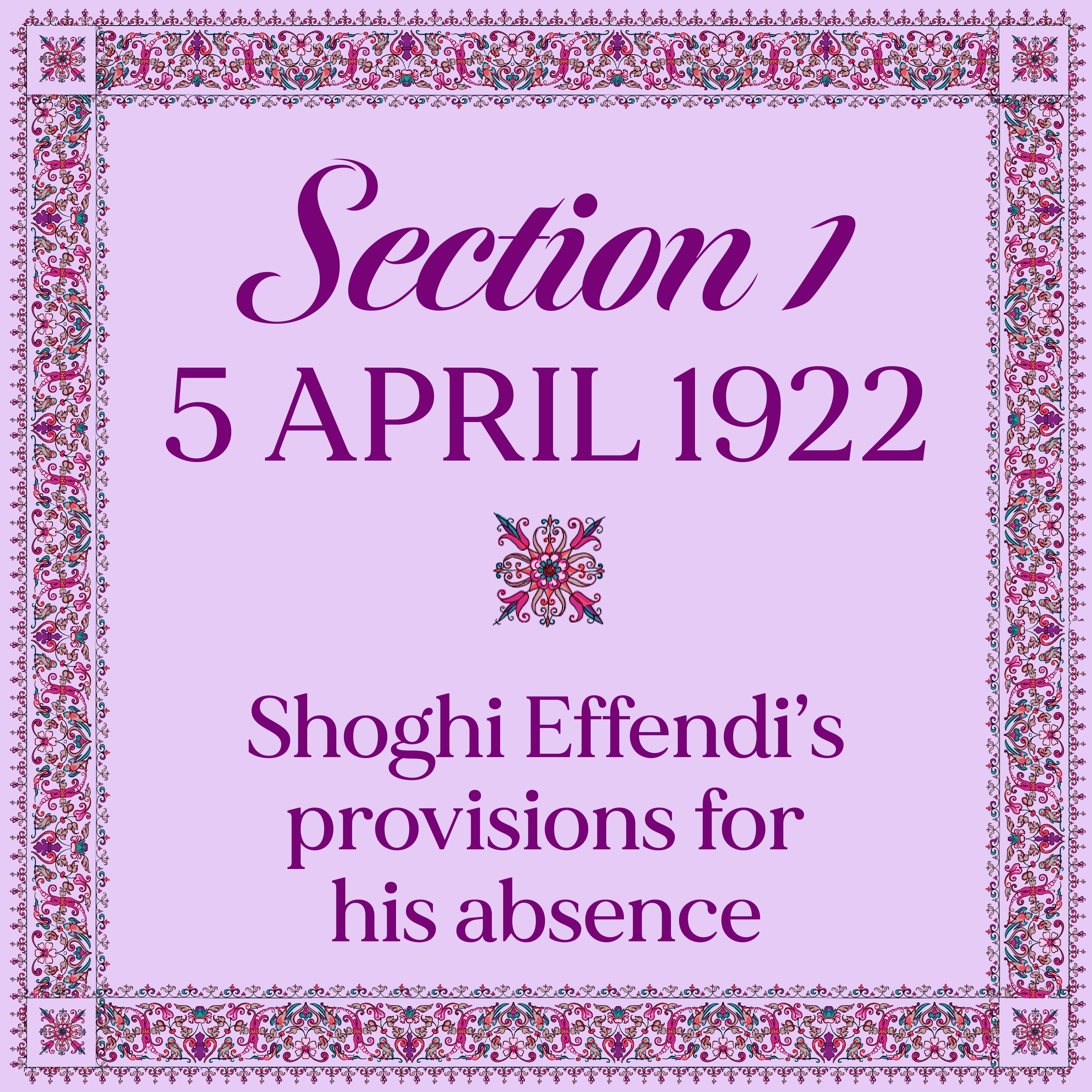 The Greatest Holy Leaf then shared with the Bahá'í world the provisions of the Guardian for the administration of the Cause during his forced absence and enclosed the Guardian’s letter announcing his departure from the Holy Land.