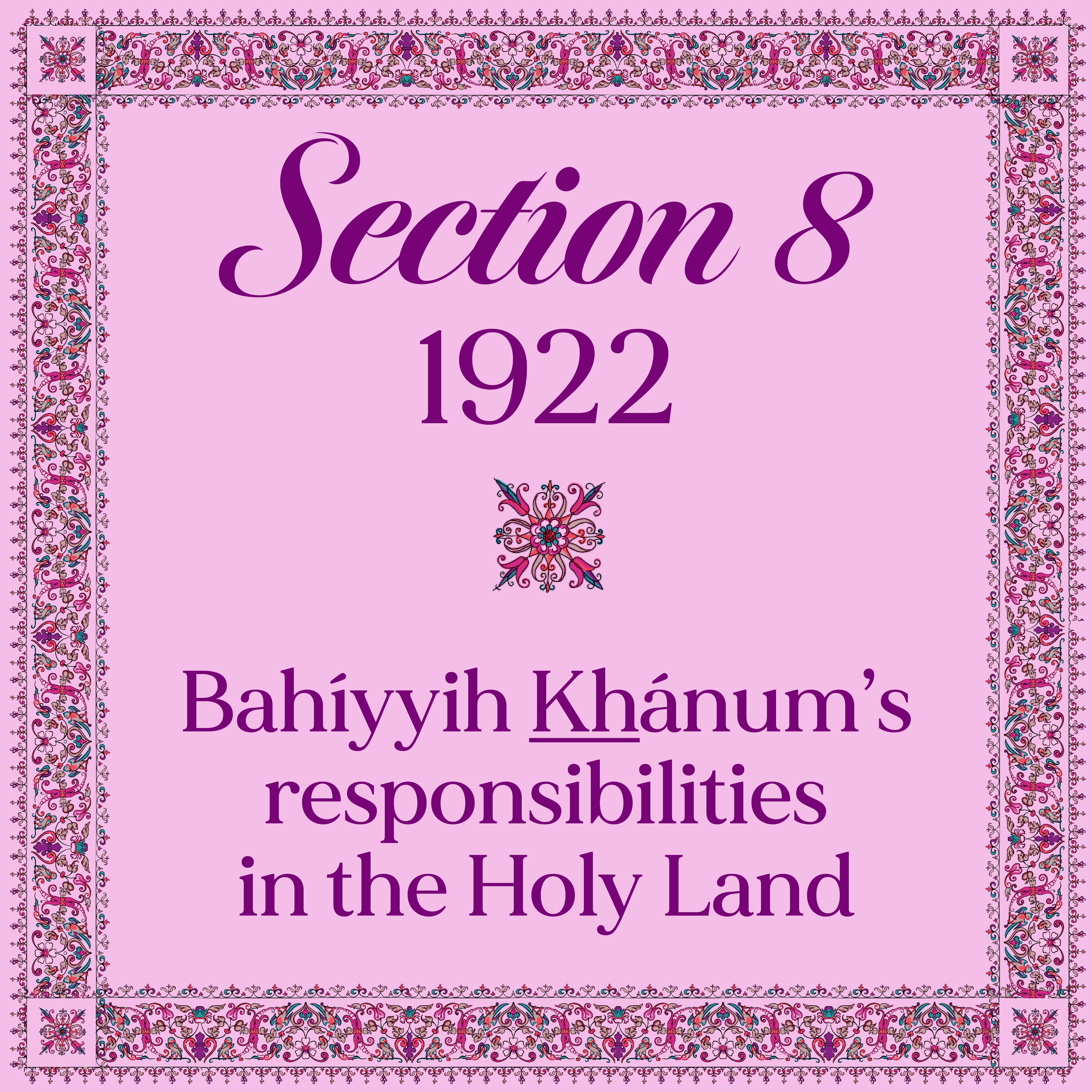 Starting on 5 April 1922 for eight full months until 15 December 1922, the Greatest Holy Leaf was now in charge of administering the domestic and international affairs of the Bahá'í Faith—assisted by the Holy Family and the members of the appointed committee until the Guardian’s return.