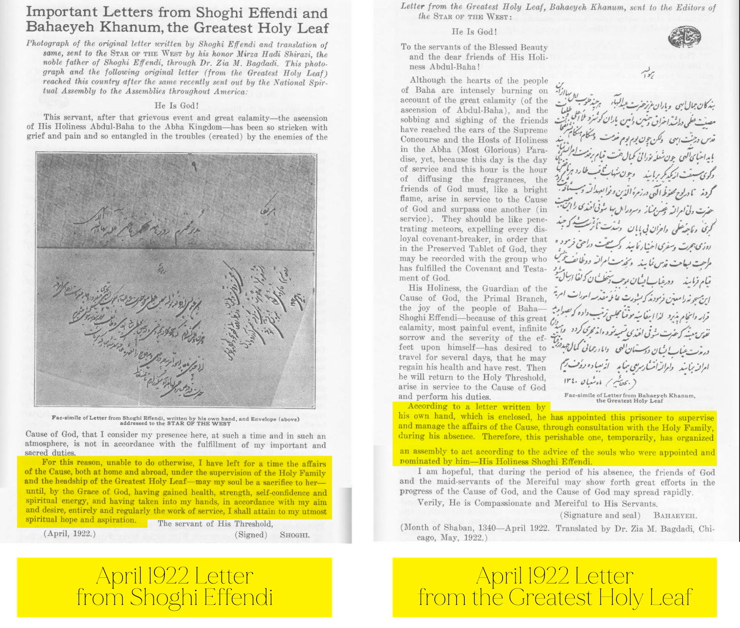 April 1922: The letters of Shoghi Effendi and the Greatest Holy Leaf published in Star of the West