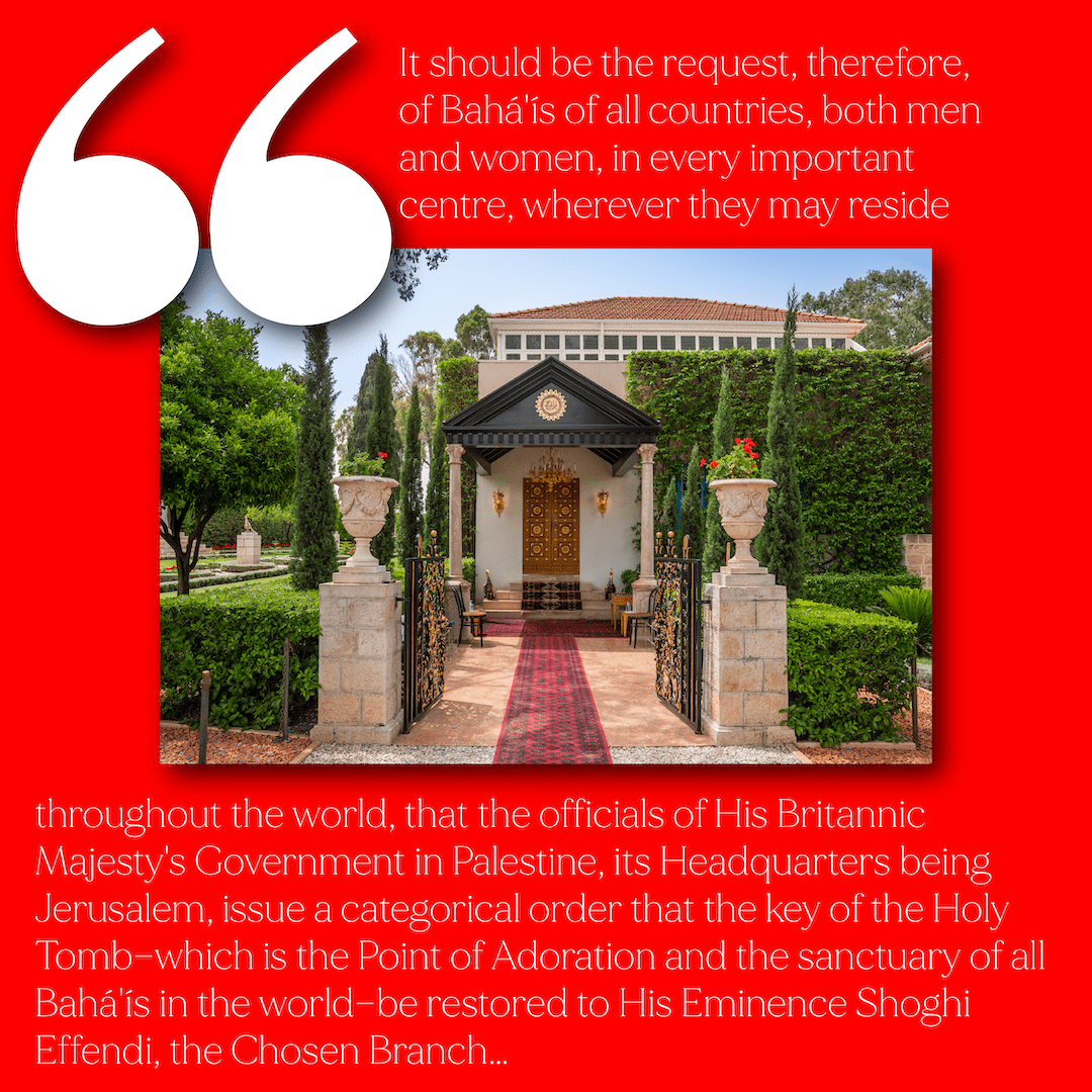 It should be the request, therefore, of Bahá'ís of all countries, both men and women, in every important centre, wherever they may reside throughout the world, that the officials of His Britannic Majesty's Government in Palestine, its Headquarters being Jerusalem, issue a categorical order that the key of the Holy Tomb—which is the Point of Adoration and the sanctuary of all Bahá'ís in the world—be restored to His Eminence Shoghi Effendi, the Chosen Branch…
