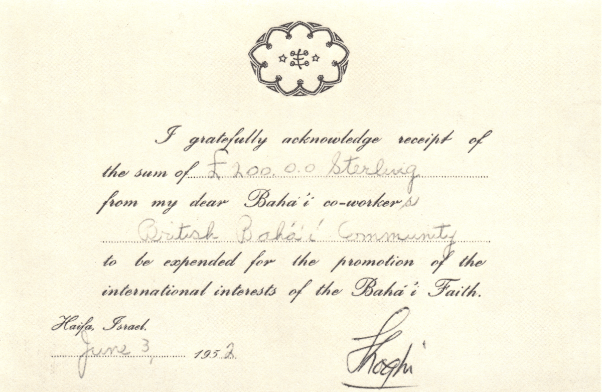 Lastly, one of the responsibilities of Bahíyyih Khánum as the headship of the Faith was to receive and acknowledge financial contributions from Bahá'ís the world over.