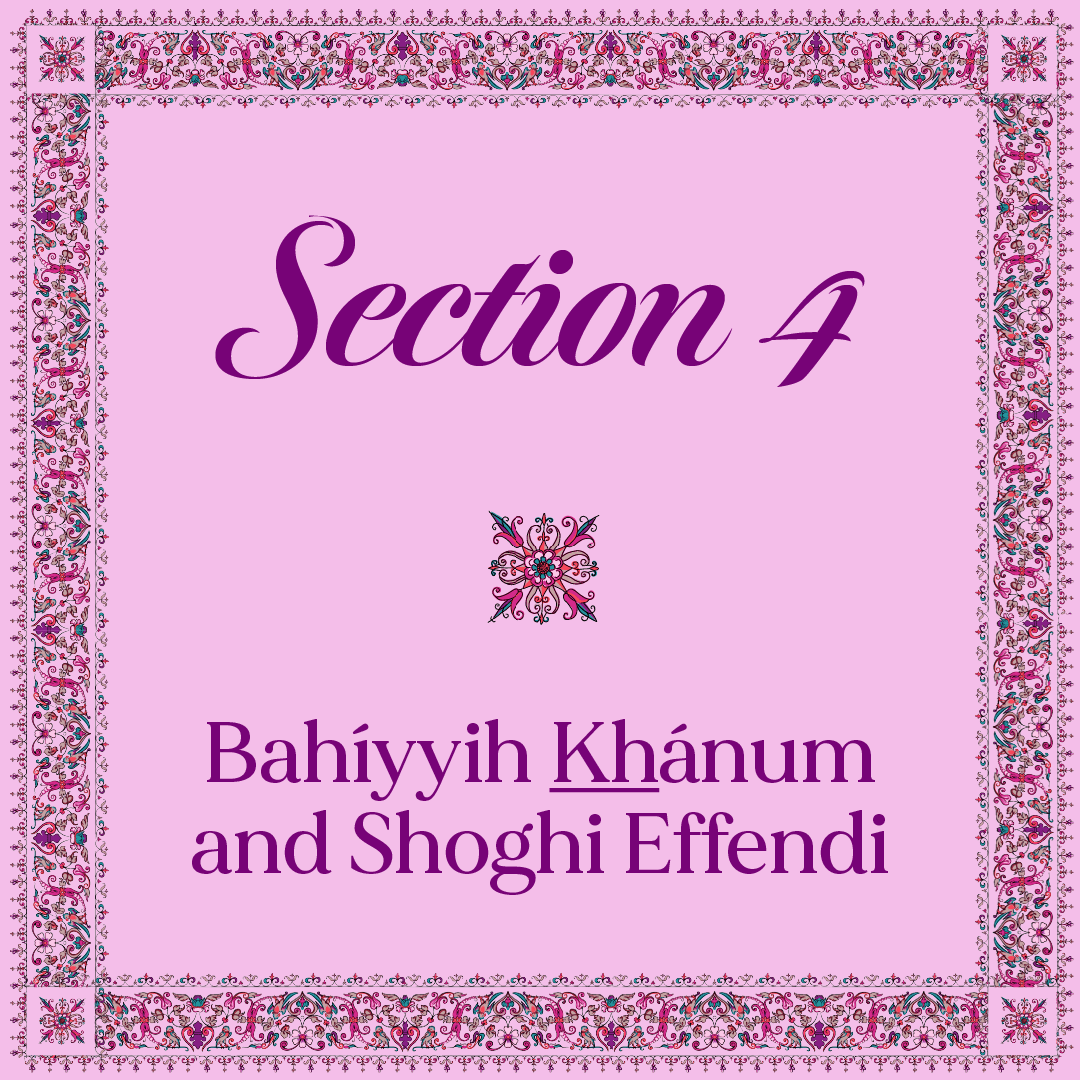Bahíyyih Khánum: The Greatest Holy Leaf by Bahá’u’lláh, Abdu’l-Bahá, Shoghi Effendi, and Bahíyyih Khánum, compiled by Research Department of the Universal House of Justice Haifa: Bahá’í World Centre Publications (1982): (in the order in which they are quoted in this section): Selections 19, 14, and 17 from the Writings of ‘Abdu’l-Bahá, pages 17,15, and 16-17.