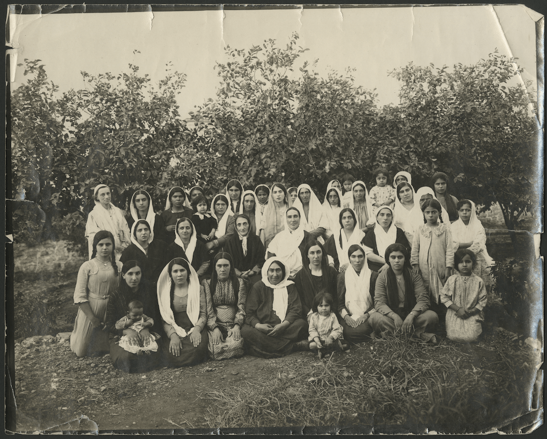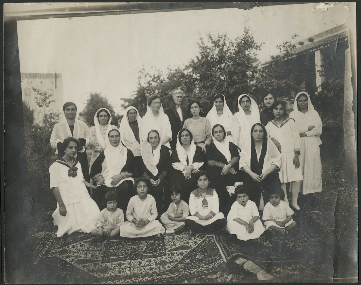 A photograph dated February 1920 of the women of the Holy Family, all seated in the middle row, on chairs, surrounded by pilgrims, resident believers and children. © United States National Bahá'í Archives, used with permission.