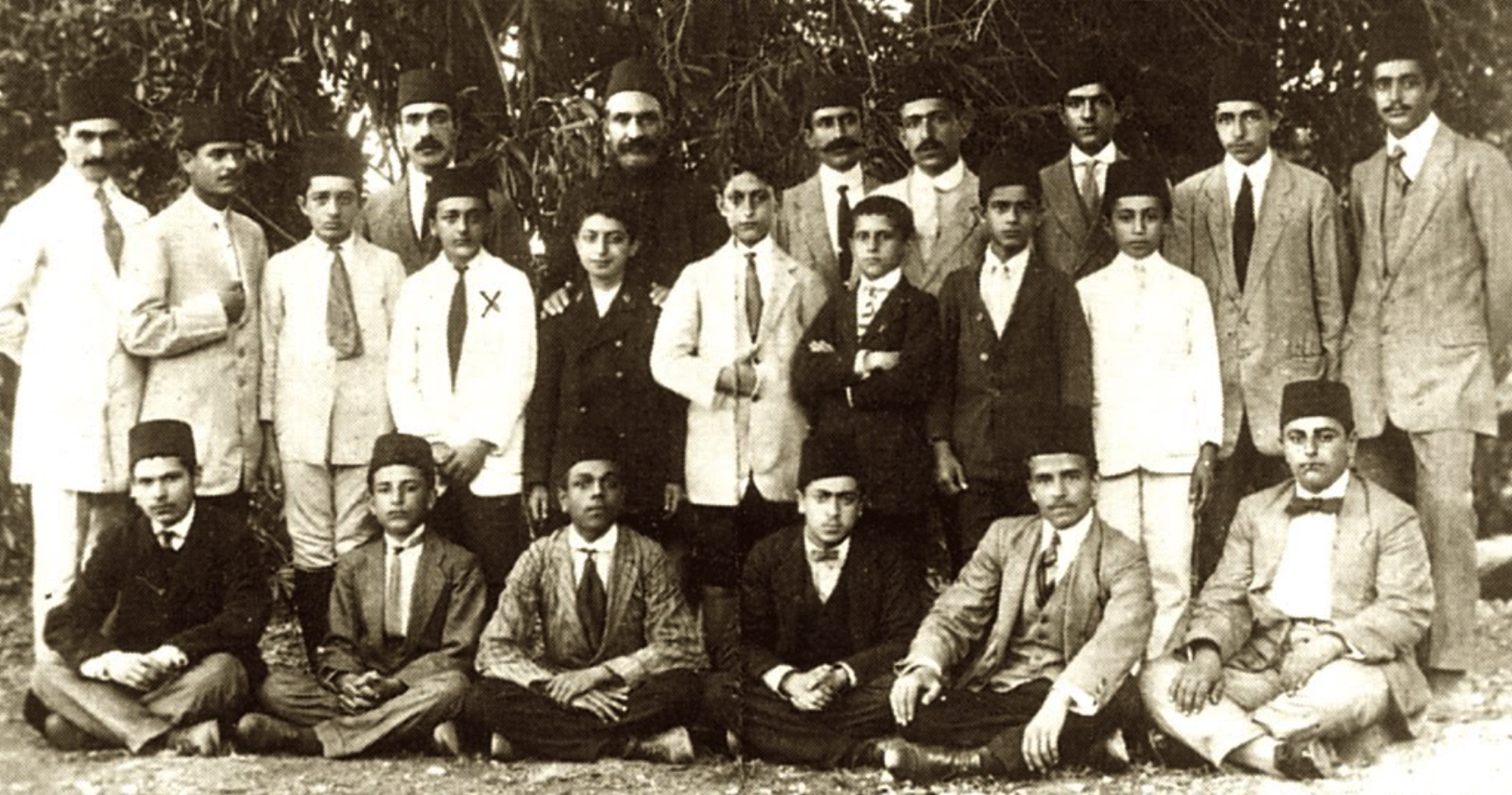 Shoghi Effendi with his classmates at Syrian Protestant College in 1913. Shoghi Effendi is indicated with an X on his white jacket. Source: Worldwide Community of Bahá'u'lláh.