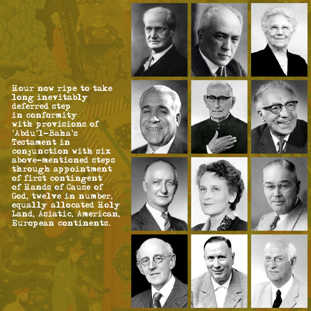 The Guardian appointed three Hands of the Cause for each continent: the Holy Land, Iran, America, and Europe as the nascent appointed arm of Bahá'u'lláh’s Administrative Order, and 12 people’s lives changed forever.