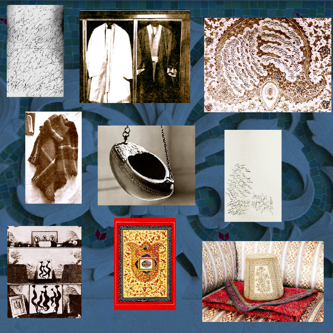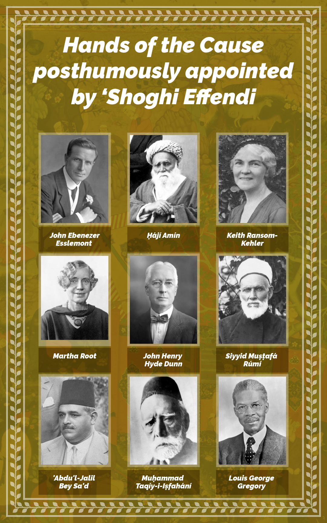 The nine Hands of the Cause whom Shoghi Effendi appointed posthumously during the first 30 years of his ministry, from 1925 to 1951. Background image: Persian miniature from The British Museum.