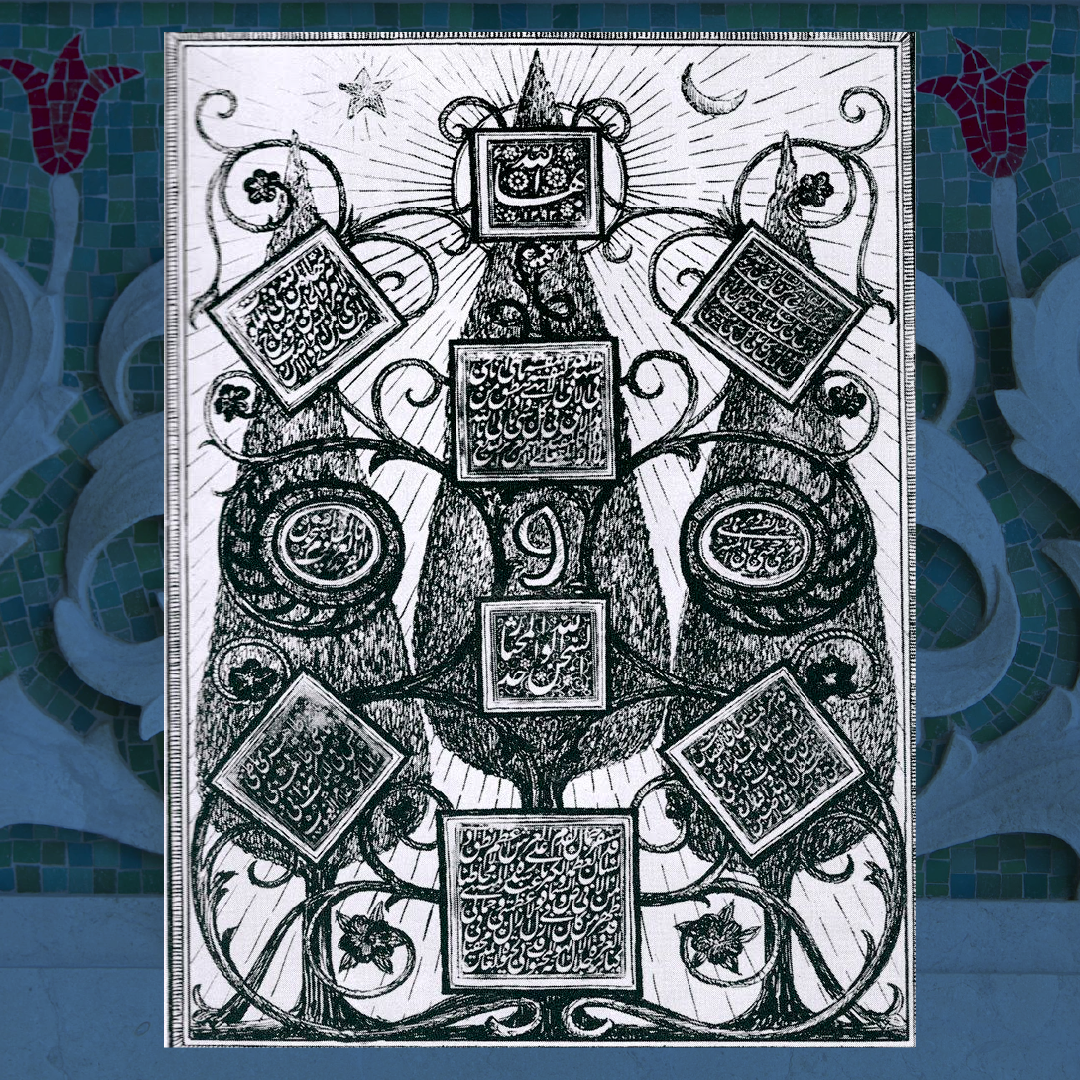 The four Hands of the Cause whom Bahá'u'lláh appointed during His lifetime. Background image: Persian miniature from The British Museum.