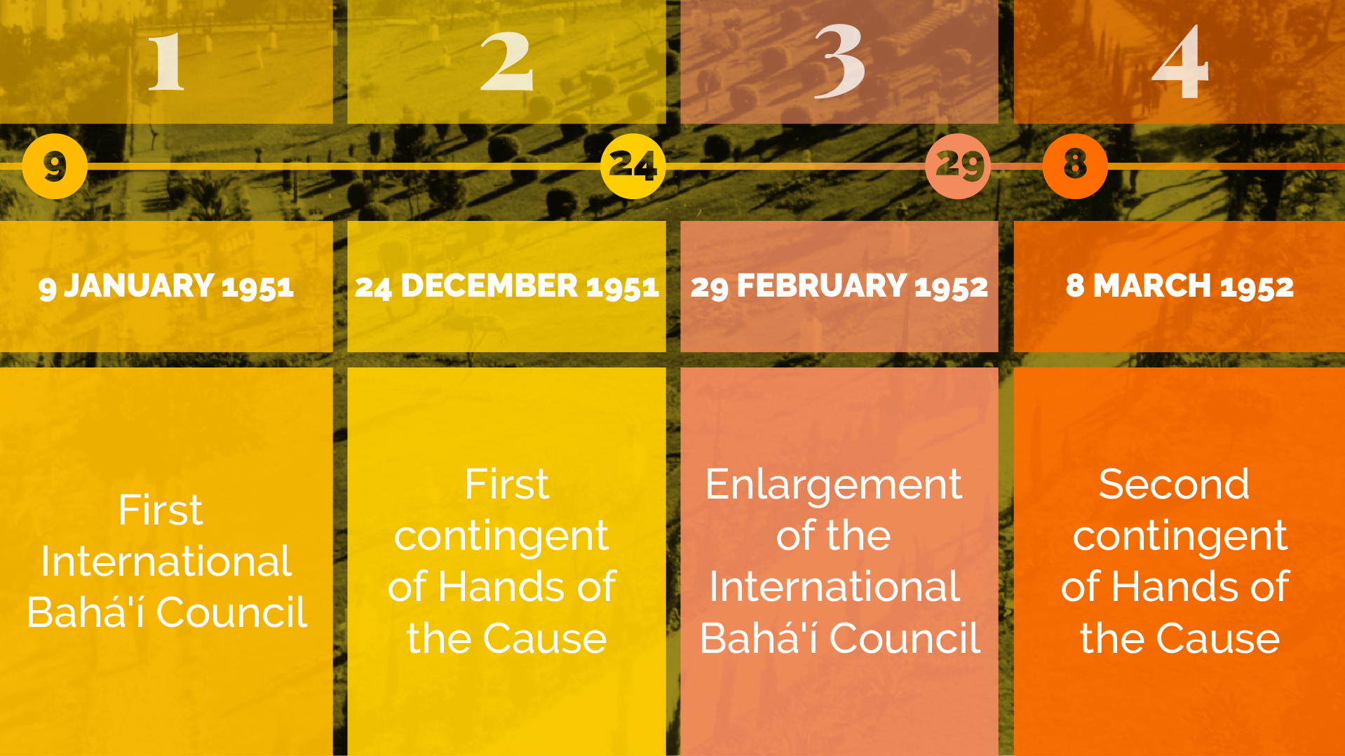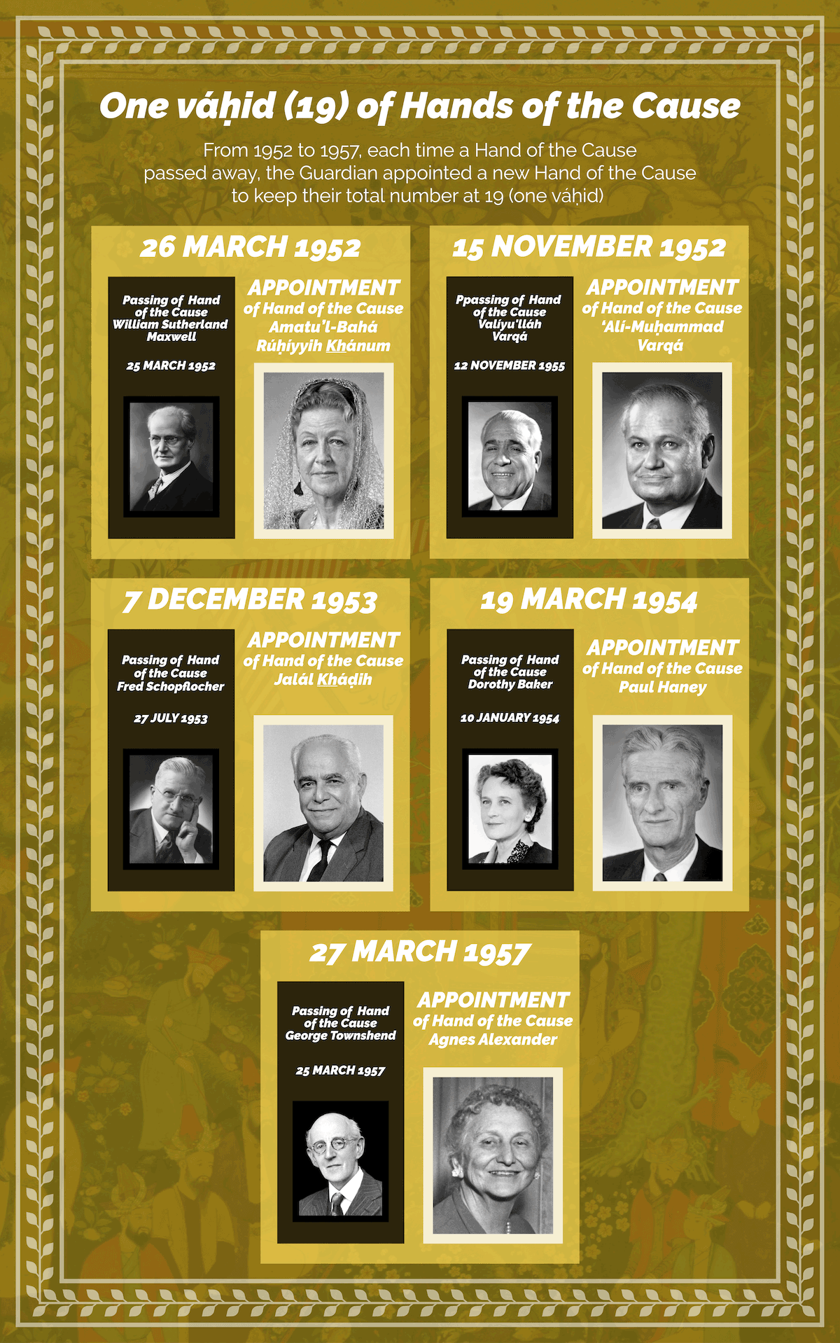 In a two-month period between December 1951 and February 1952, the Guardian appointed 19 Hands of the Cause. In Bahá'í terminology, the number 19 represents one Vaḥíd. One Vaḥíd is considered a unit.