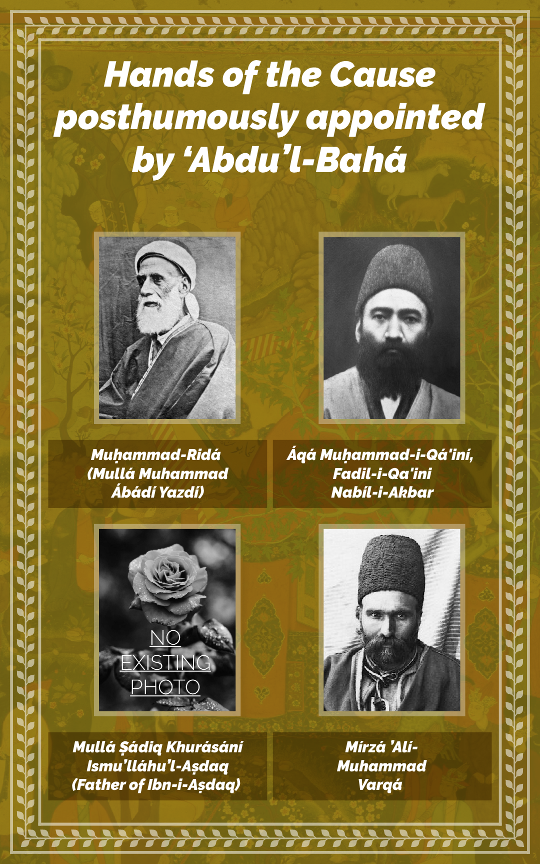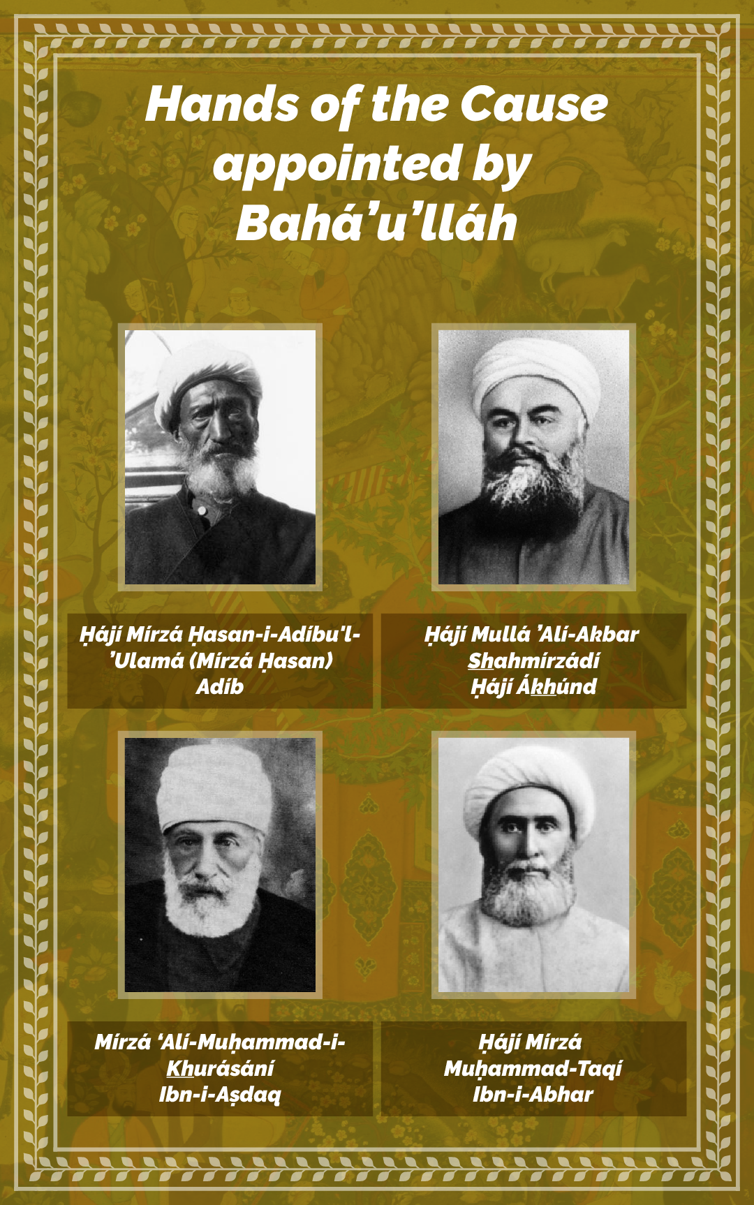 The four Hands of the Cause whom 'Abdu'l-Bahá appointed during posthumously in 1915. Background image: Persian miniature from The British Museum.