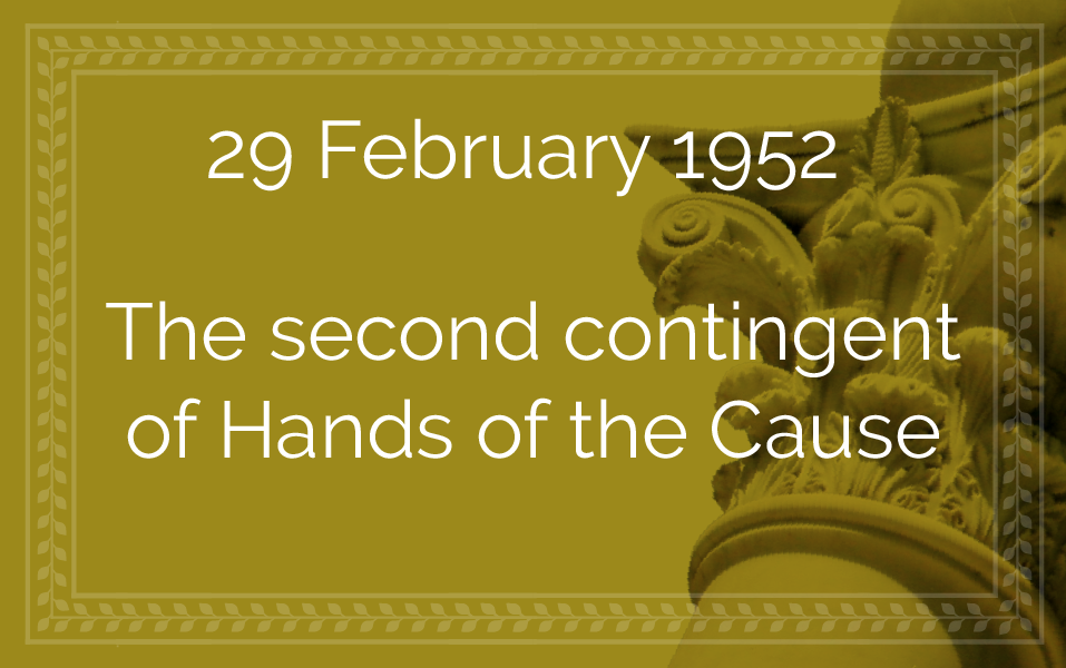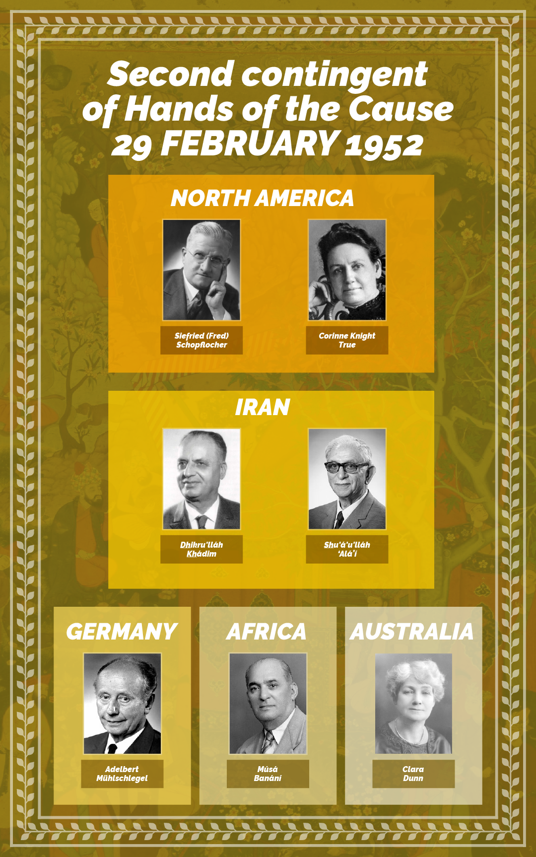 Exactly two months after the announcement of the first contingents of Hands of the Cause, the Guardian sent a second announcement on 29 February 1952, elevating seven more Bahá'ís to the rank of Hand of the Cause and bringing the total number of Hands of the Cause worldwide to 19.
