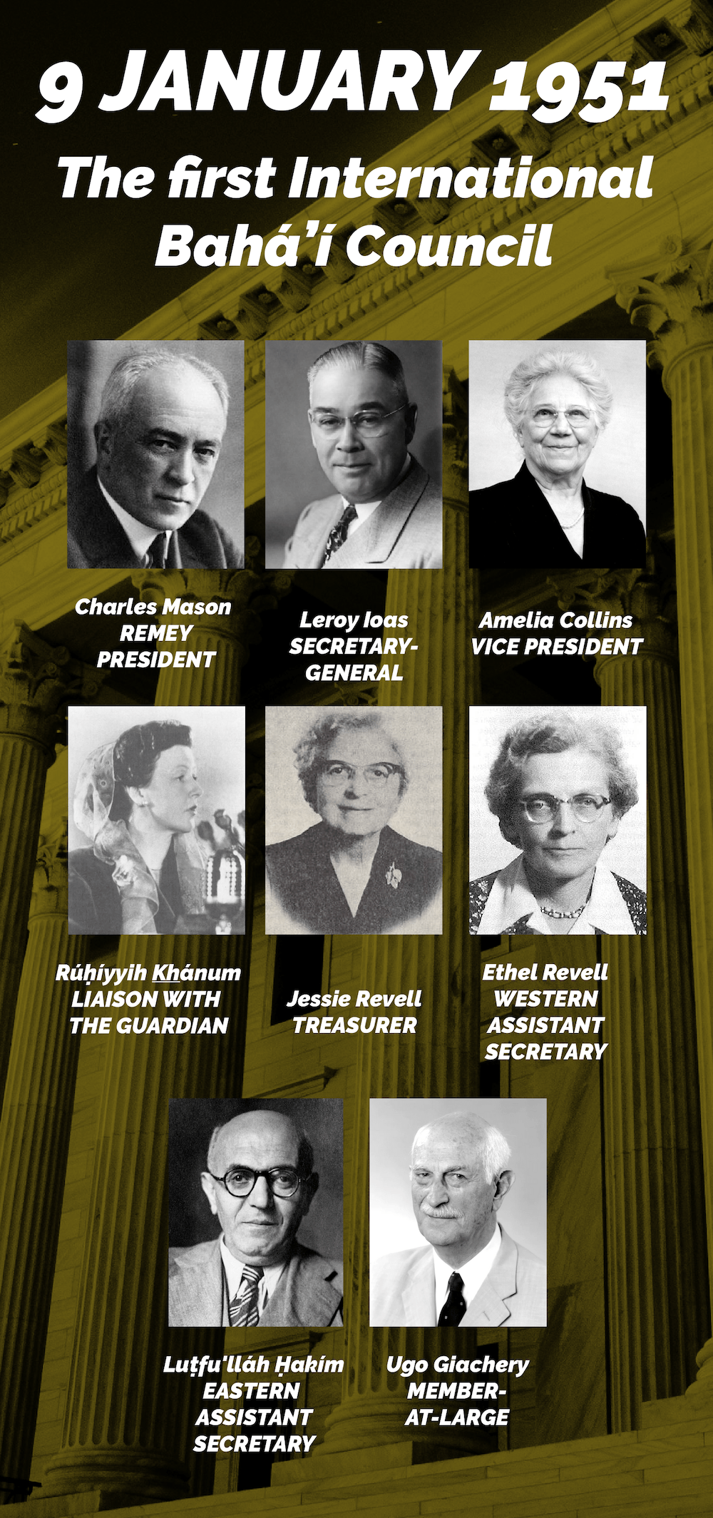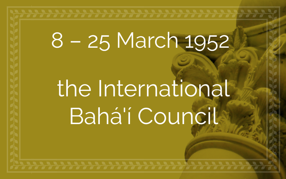 - Second, the formation of the International Bahá'í Council in Haifa, the forerunner of the Universal House of Justice, itself the legislative organ of Bahá'u'lláh’s divinely-conceived, worldwide Bahá'í Administrative Order.