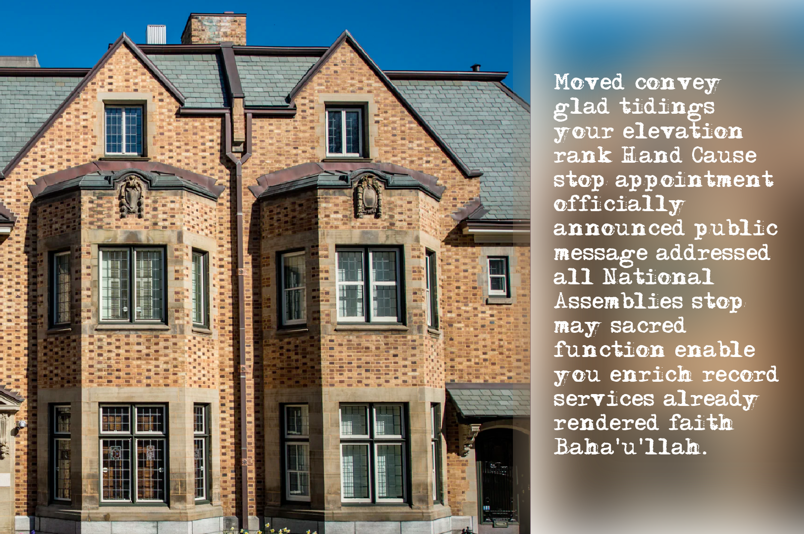 Moved convey glad tidings your elevation rank Hand Cause stop appointment officially announced public message addressed all National Assemblies stop may sacred function enable you enrich record services already rendered faith Bahá'u'lláh.