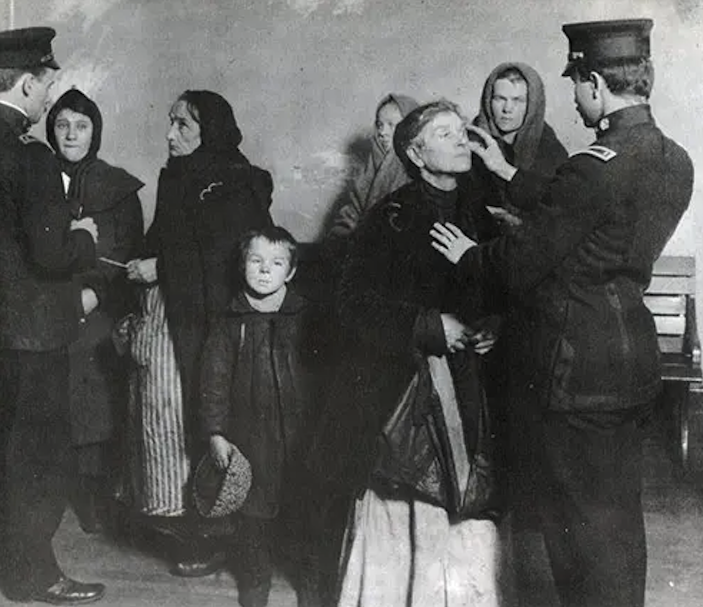 A medical inspection at Ellis Island, New York 1912. The health inspector is looking for trachoma inside the passenger’s eyes, the same inspection Shoghi Effendi was subjected to in Naples, that same year. Source: Library of Congress.