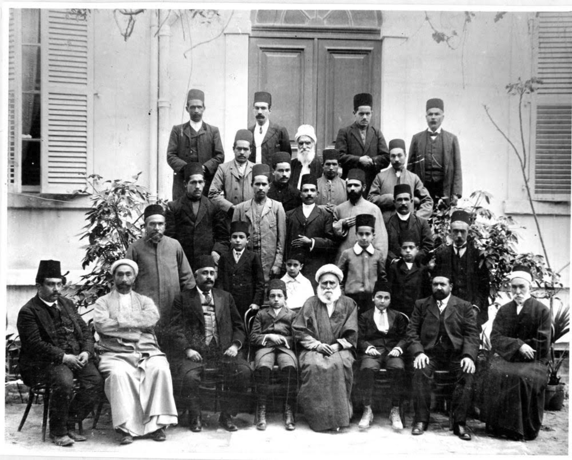 Shoghi Effendi in Ramleh in 1910. Seated in the front row, in the very center of the photograph is Ḥájí Amín, with a white beard—later elevated posthumously to the rank of Hand of the Cause by the Guardian—next to him is Shoghi Effendi. Standing behind Shoghi Effendi is ‘Alí Yazdí. ‘Alí Yazdí’s father, Ḥájí Muḥammad Yazdí is seated third from the right in the front row. Source: Blessings Beyond Measure by ‘Alí Yazdí, page 51. Higher resolution photograph provided by Dr. Behrad Majidi with our many thanks.