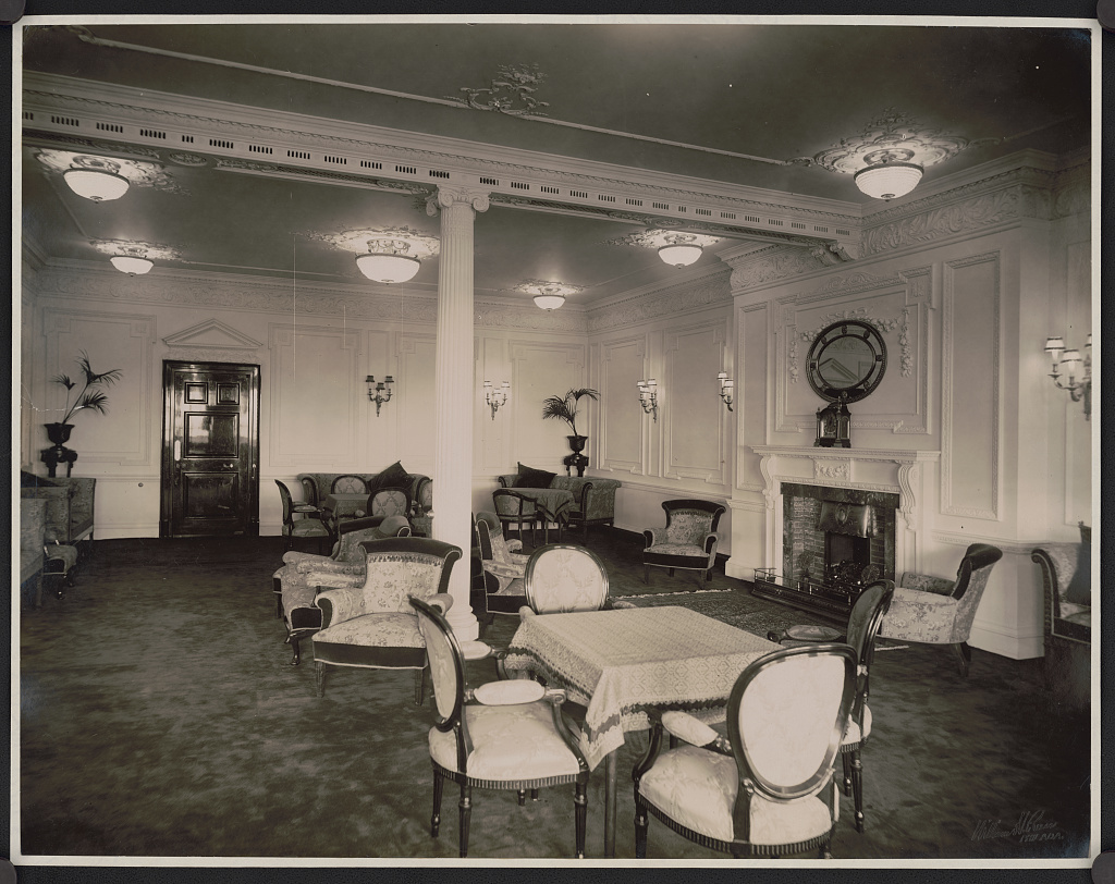 White Star Steamship Olympic reading room, very similar to the reading room inside the RMS Cedric, from the same company. Source: Wikimedia Commons.