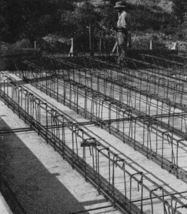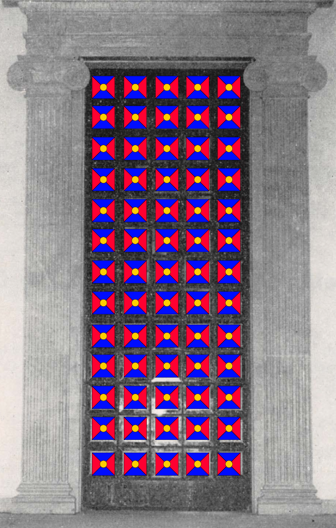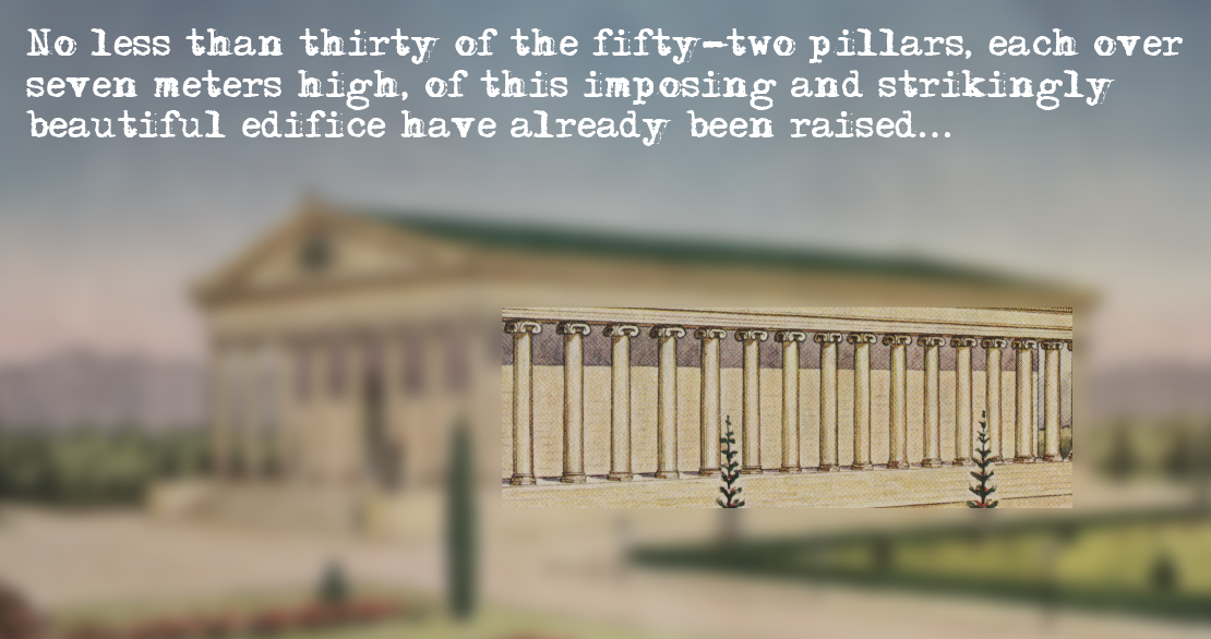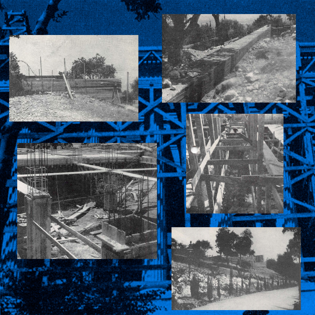 15 columns—half the Guardian’s achievement at this stage of construction—highlighted over the watercolor of the architectural drawing of the Archives. © United States National Bahá'í Archives, used with permission.
