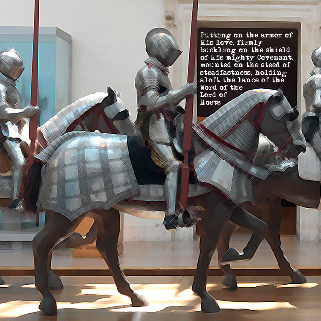 “Putting on the armor of His love, firmly buckling on the shield of His mighty Covenant, mounted on the steed of steadfastness, holding aloft the lance of the Word of the Lord of Hosts” Photograph of The Metropolitan Museum of Art exhibit showing knights mounted on armored horses, holding aloft a lance, and protected by shields. Source: The Met.