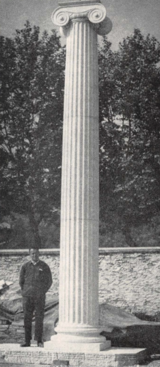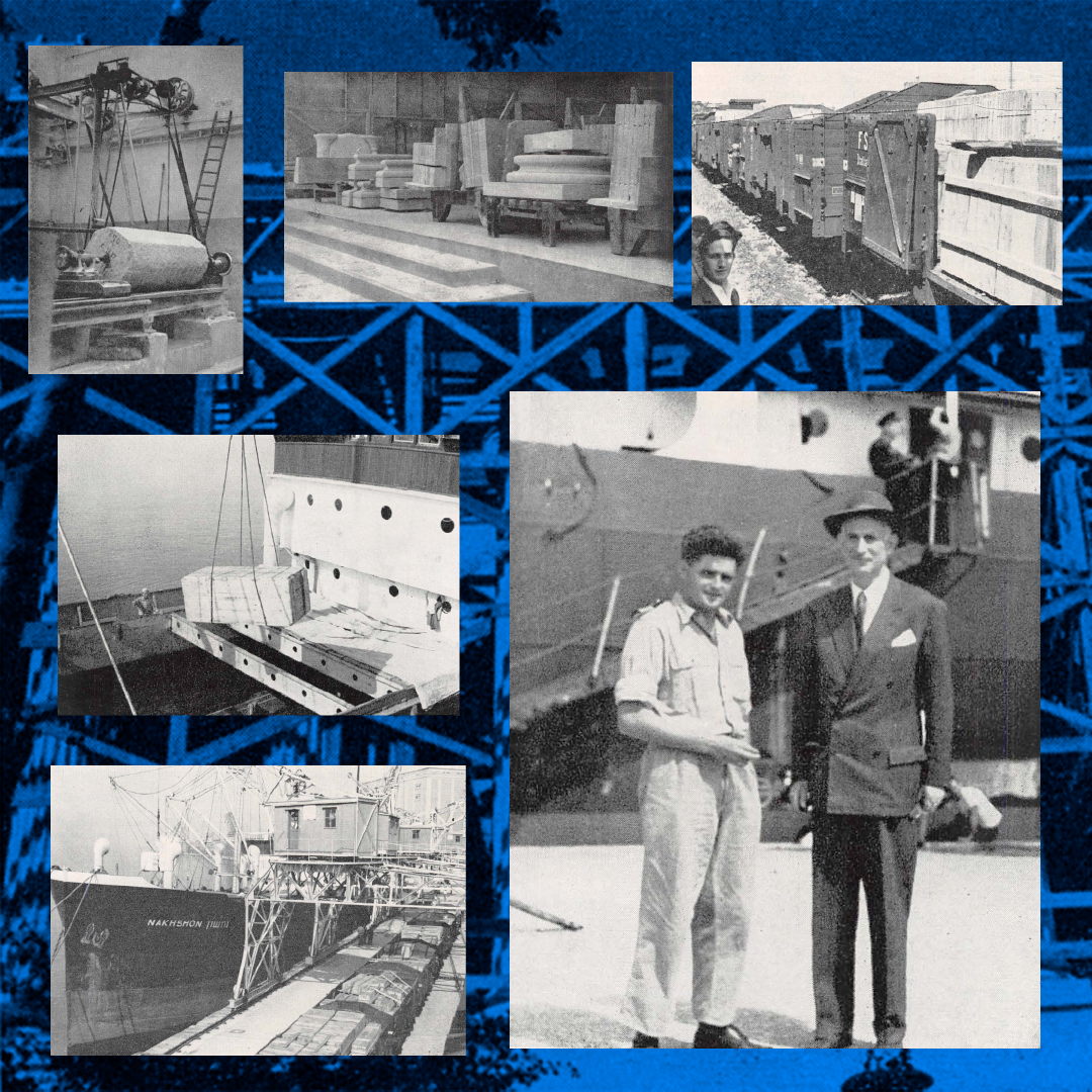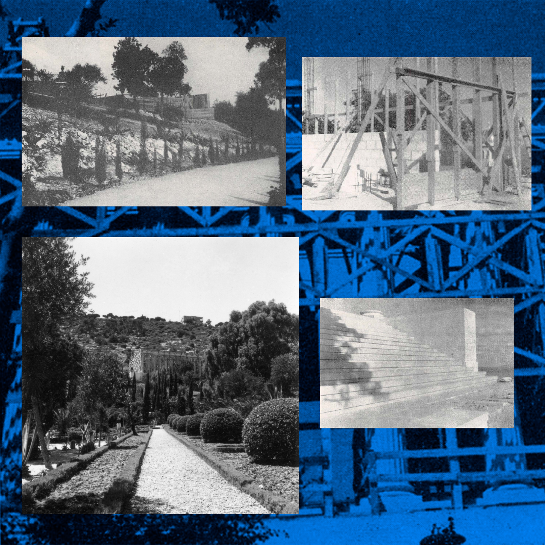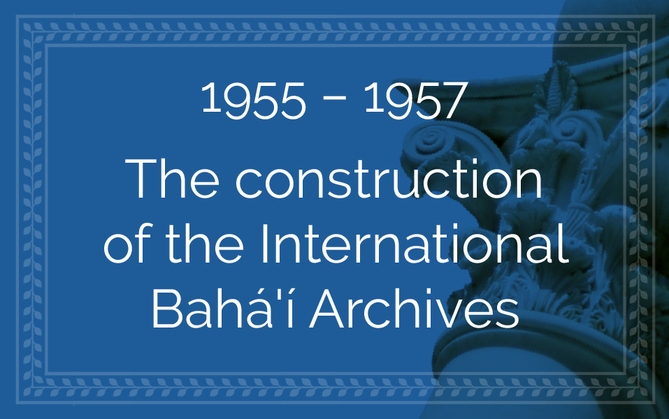 …on the other, through the laying of the foundation, and the erection of some of the pillars, of the facade and of the northern side of the International Bahá'í Archives—the first of the major edifices destined to constitute the seat of the World Bahá'í Administrative Center to be established on Mt. Carmel. No less than thirty of the fifty-two pillars, each over seven meters high, of this imposing and strikingly beautiful edifice have already been raised, whilst half of the nine hundred tons of stone ordered in Italy for its construction have already been safely delivered at the Port of Haifa. A contract, moreover, for over fifteen thousand dollars has been placed with a tile factory in Utrecht for the manufacture of over seven thousand green tiles designed to cover the five hundred square meters of the roof of the building.