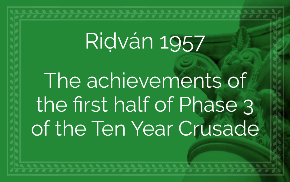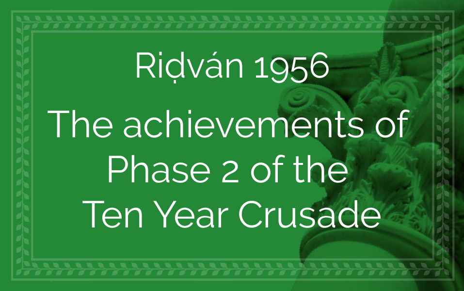 In his Riḍván message of 1956 the Guardian, as the Bahá'í world was entering into the third phase of the first five years in its world Crusade, highlighted the achievements attained by its band of heroes over the course of the two years since its inaugural phase:
