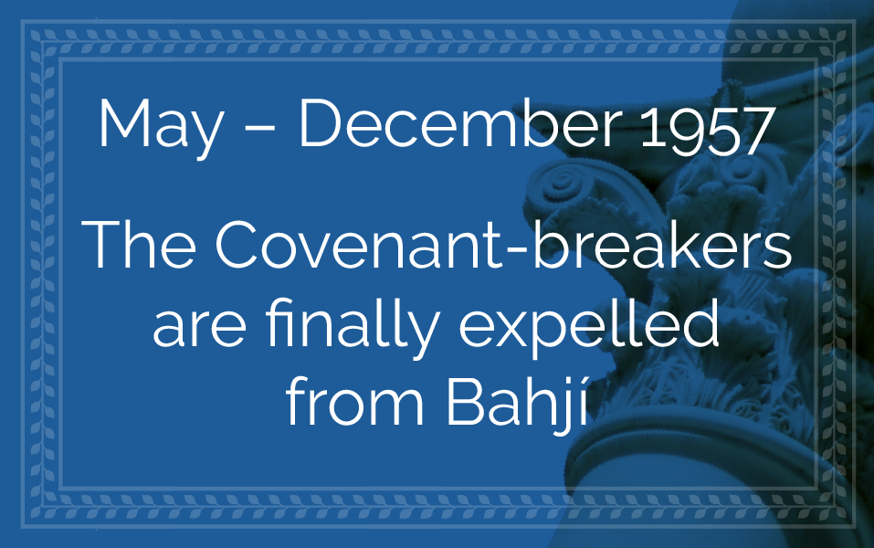 Messages to the Bahá’í World: 1950–1957, Shoghi Effendi, Bahá’í Publishing Trust, Wilmette, Illinois, 1971, Cable from Shoghi Effendi dated 3 June 19567: Epoch-Making Victory Won Over Covenant-Breakers, page 120-122.
