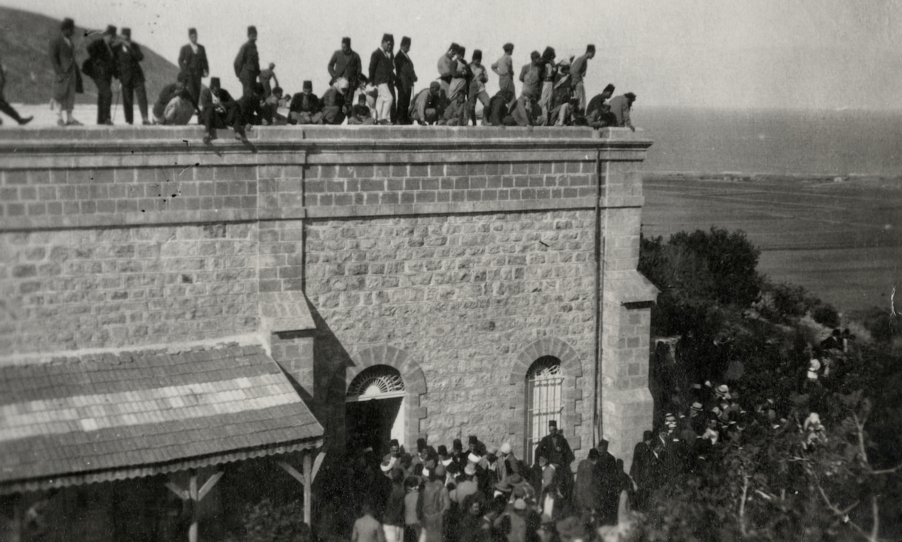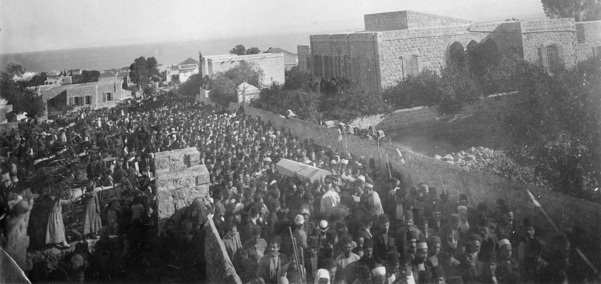 This photograph of ‘Abdu'l-Bahá as one of the pallbearers of Mírzá Ḥasan Afnán, is one of the last photographs ever taken of the Master. a very grainy, and cropped version of this photograph was published in Star of the West Volume XII, number 18 on page 281. This copy was provided for the chronology courtesy of the National Bahá'í Archives of the United States, uncropped and in high-definition. The caption on the back of the photo reads: "The Master carrying the coffin of Mírzá Abu’l-Ḥasan Afnán on His shoulders. Photo taken by L.S.H. [Luṭfu’lláh Ḥakím, future member of the Universal House of Justice] ten days before the Master's Ascension.”
