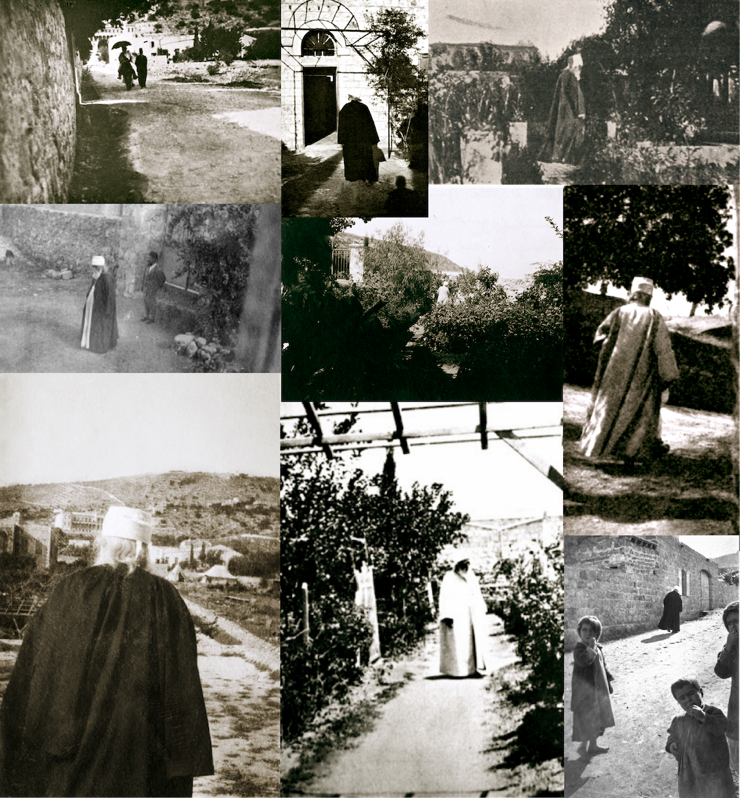 Collage of photographs of 'Abdu'l-Bahá shortly before His Ascension, showing the Master from a distance, in His gardens or walking away. Source: Violetta Zein, The Extraordinary Life of 'Abdu'l-Bahá: The illustrated chronology of the life of 'Abdu'l-Bahá Part 9: The Ascension of 'Abdu'l-Bahá.