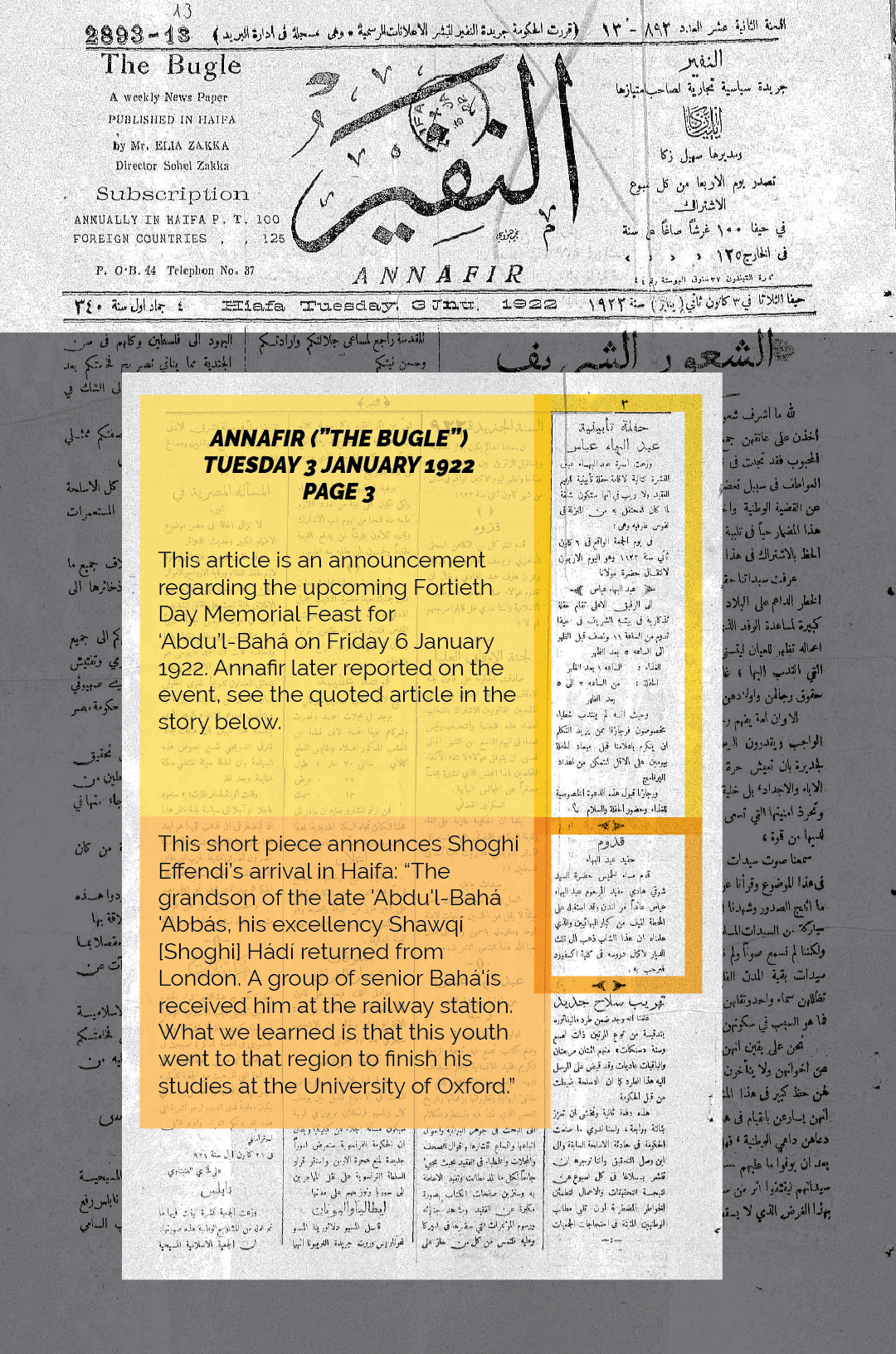 Shoghi Effendi would stay with Dr. Esslemont between December 2 and 7 until he received a cable from his great-aunt, the Greatest Holy Leaf, asking him to return to Haifa.
