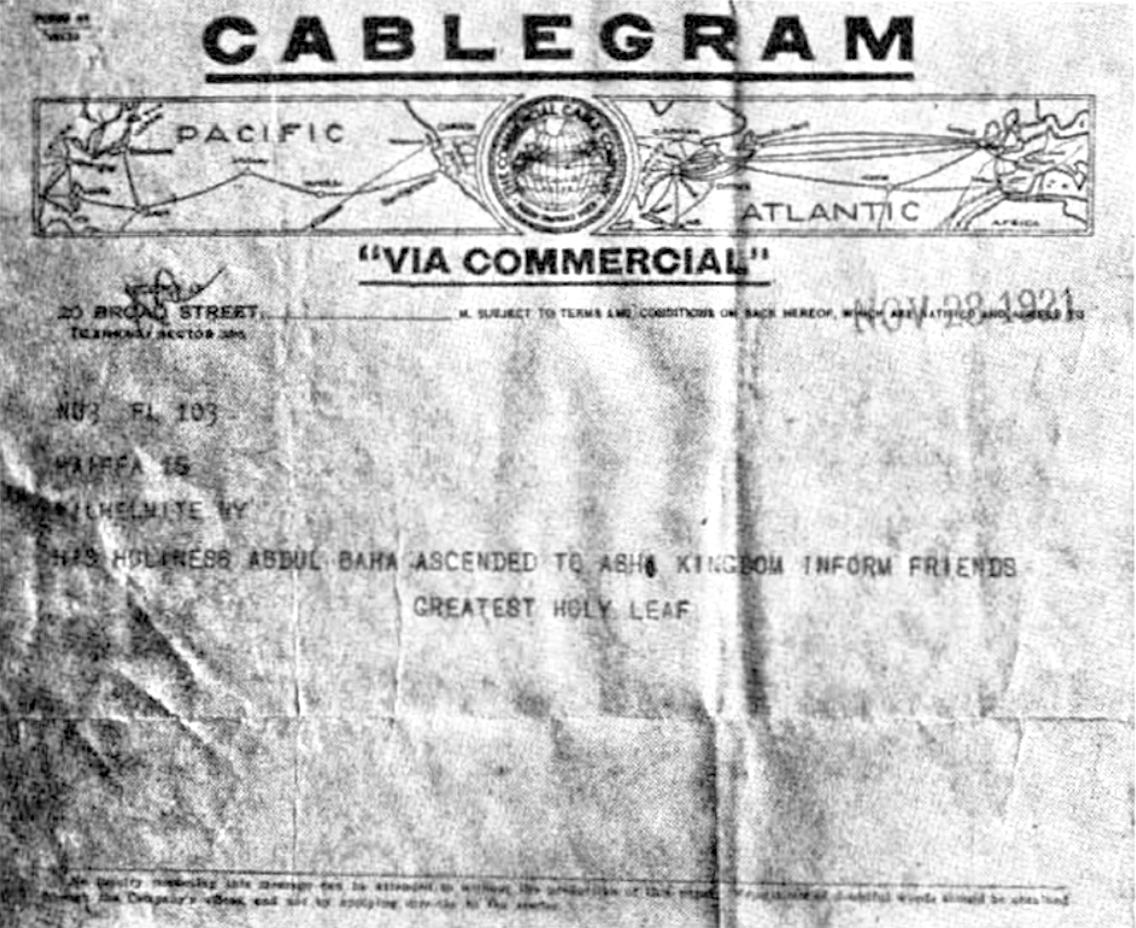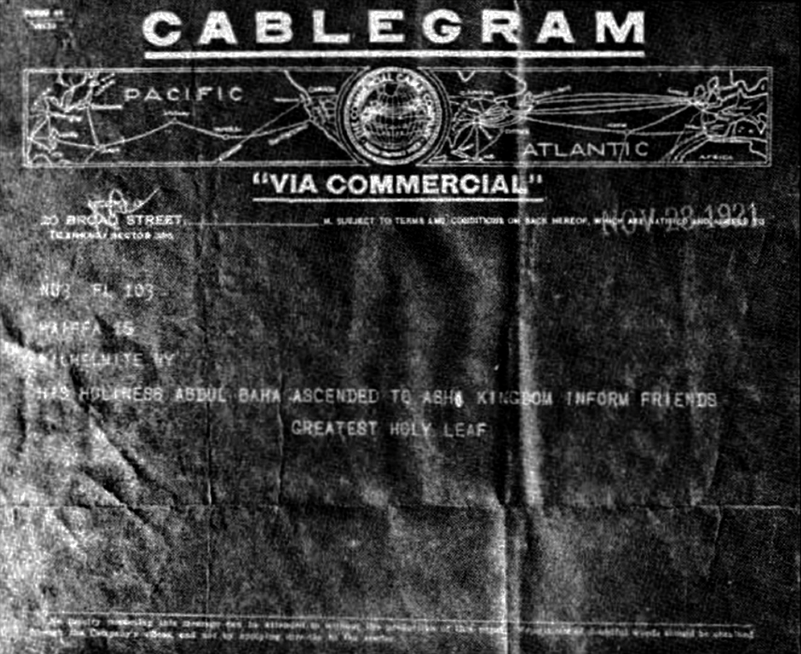 This was the cable Shoghi Effendi saw in Major Tudor Pole’s office which caused him to faint. He had learned of his own Grandfather’s passing after most Bahá'ís, and in the exact same unceremonious manner.
