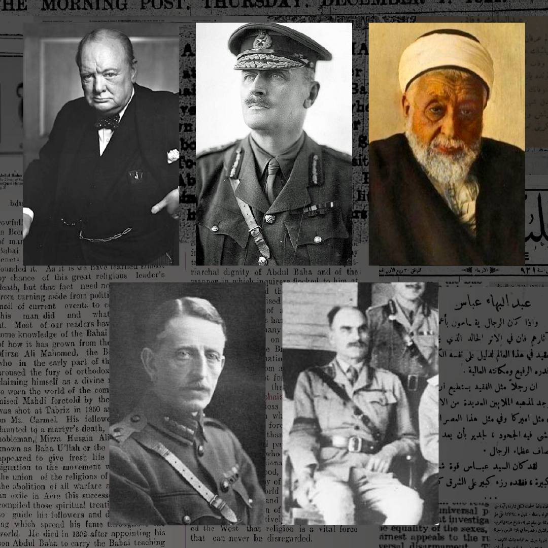 Photomontage of eminent personalities who sent condolence messages for the passing of 'Abdu'l-Bahá. Top row, left to right: Sir Winston Churchill ( Wikimedia Commons), Viscount Edmund Allenby (Wikimedia Commons), and Abd Al-Rahman Al Gailani (Wikimedia Commons). Bottom row: General Sir Walter Norris Congreve (Royal Green Jackets Museum) and Sir Arthur Money (The Imperial War Museums).