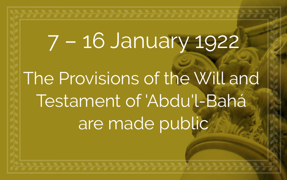 16 January 1922: Provisions of the Will and Testament of ‘Abdu’l-Bahá announced to American Bahá’ís