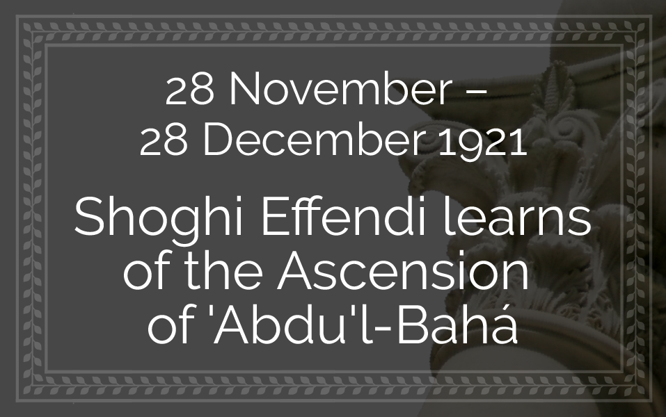 In an undated letter he wrote between 2 and 7 December 1921 in Bournemouth, Shoghi Effendi writes astonishing words about the passing of 'Abdu'l-Bahá and its implications for the ushering in of a new era for the Bahá'í Faith, as well as his enduring connection with 'Abdu'l-Bahá beyond this plane and into the Abhá Kingdom: