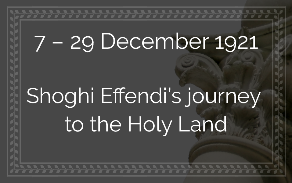 Shoghi Effendi was deeply sad and overcome with grief, but pressed on courageously, returning to London on 8 December 1921, after spending five days with his close friend, Dr. Esslemont in Bournemouth, to try and book an earlier passage to the Holy Land. He had just received a telegram from the Greatest Holy Leaf dated 7 December 1921, urging him to travel as soon as he could and he was looking for the fastest way to get to Haifa.
