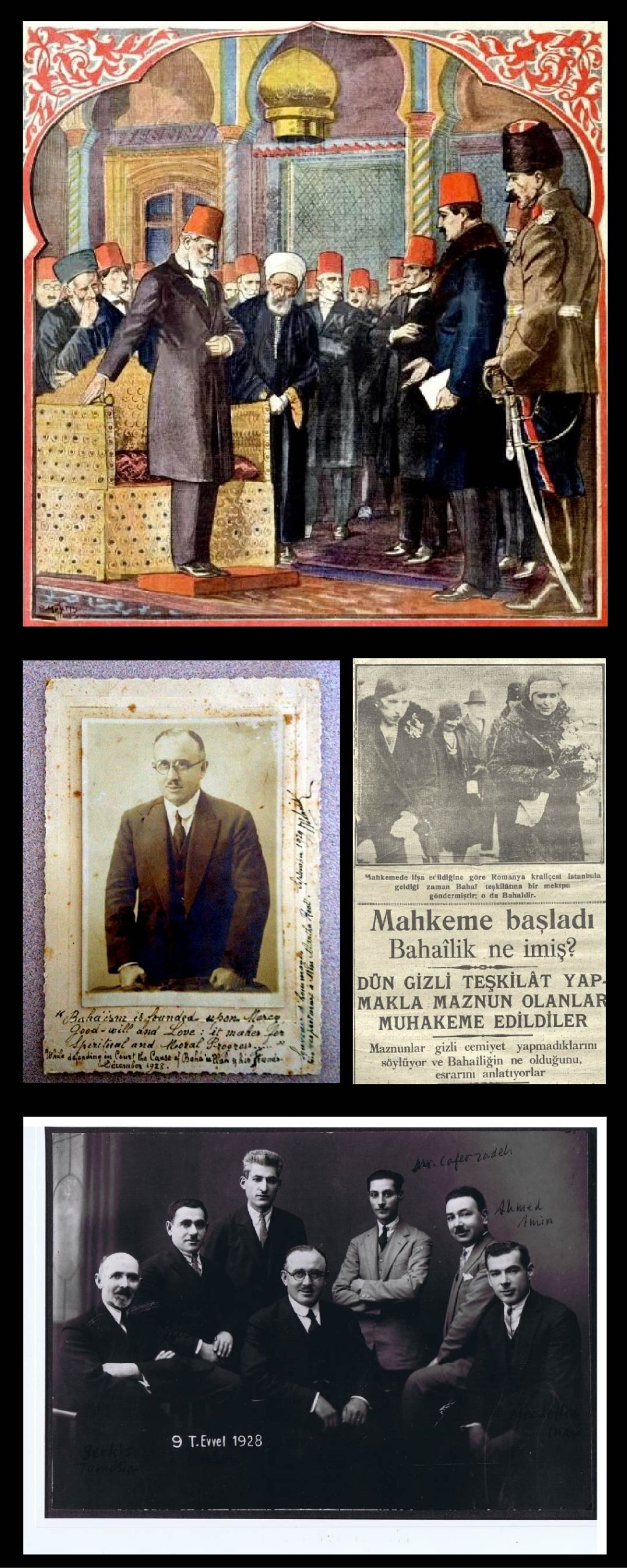Top: One of Atatürk's many reforms, the abolition of the Caliphate, from Le Petit Journal illustré, 16 March 1924. Among the many other reforms of Atatürk were the Eliminating of religious “associations” from political arena, covered in the story below. Source: Wikimedia Commons. Left: A photo of Nuri Sadik Bey, the chairman of the Local Spiritual Assembly of Istanbul, while defending the Bahá'í Faith in Court. Source: The Martha Root Archives, National Spiritual Assembly of Hawaii (courtesy of Payam Afsharian via Dr. Necati Alkan). Used with permission. Right: Front page article from the Istanbul newspaper Milliyet dated 9 December 1928 about Queen Marie, the title reads: "The trial began: what is Baha’ism supposed to be? Yesterday those who set up a secret organization were tried." The caption of the photo of Queen Marie reads: "As was disclosed during the trial the Romanian Queen sent a letter to the Baha’i organization when she arrived in Istanbul; she also is a Bahá'í." Source: Dr. Necati Alkan.