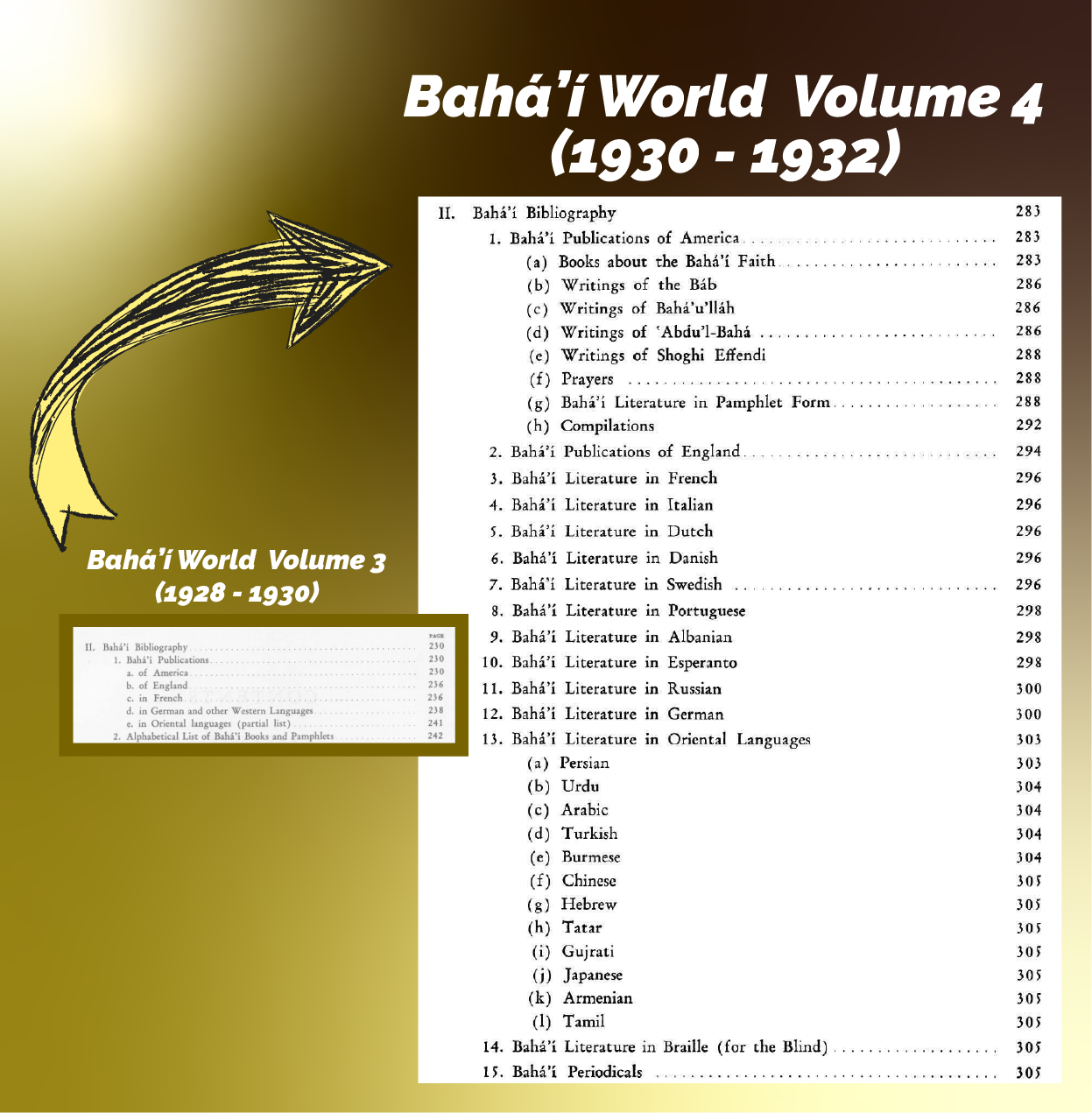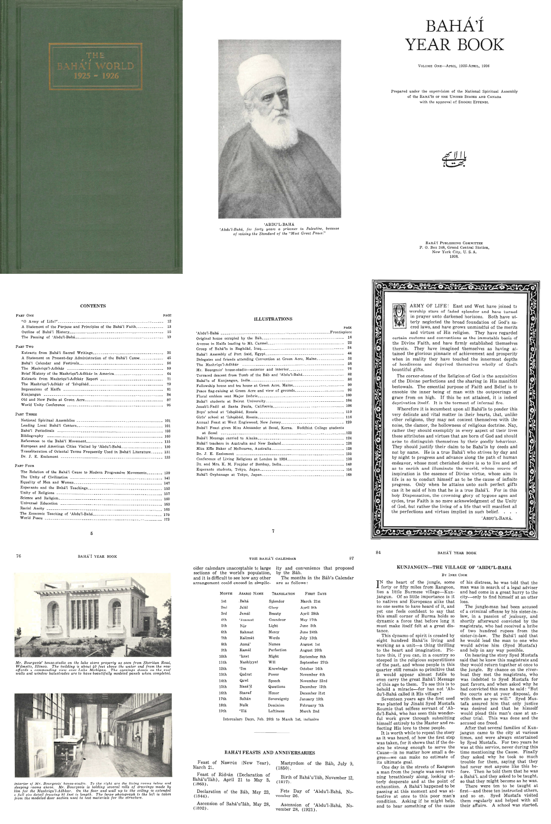 The Bahá'í World Volume 1: A sample of the extraordinary diversity of this publication, from rare photographs of the studio of Louis Bourgeois, the archictect of the Bahá'í House of Worship in North America, to an article about “'Abdu'l-Bahá’s village” in Burma, a useful Bahá'í calendar, etc.