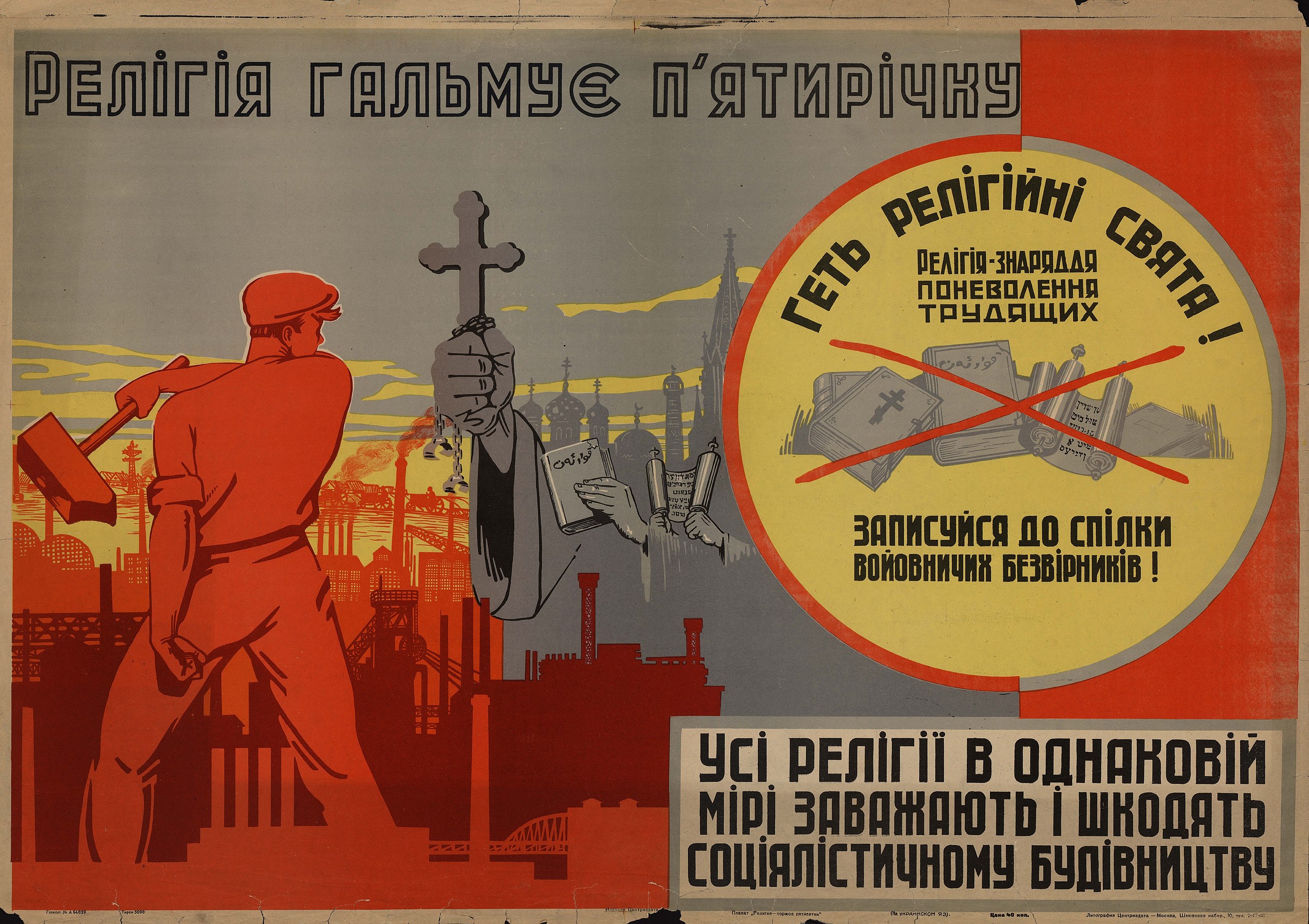 Soviet Union poster promoting their anti-religious campaign during which the House of Worship in ‘Ishqábád was seized. The poster reads: “Religion slows the five year plan! Down with religious holidays!” Source: Wikimedia Commons.
