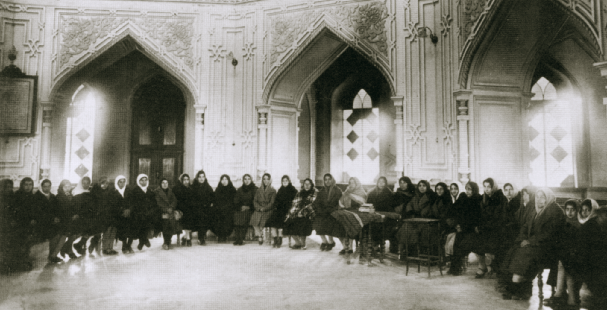 A women’s meeting inside the House of Worship in ‘Ishqábád, Turkmenistan, which was seized by the Soviet Union on 22 June 1928. The women and girls would take turns reading or chanting prayers. The exquisite interior of the Mashriqu’l-Adhkár is evident in this photograph. Source: Bahá'í Historical Facts.