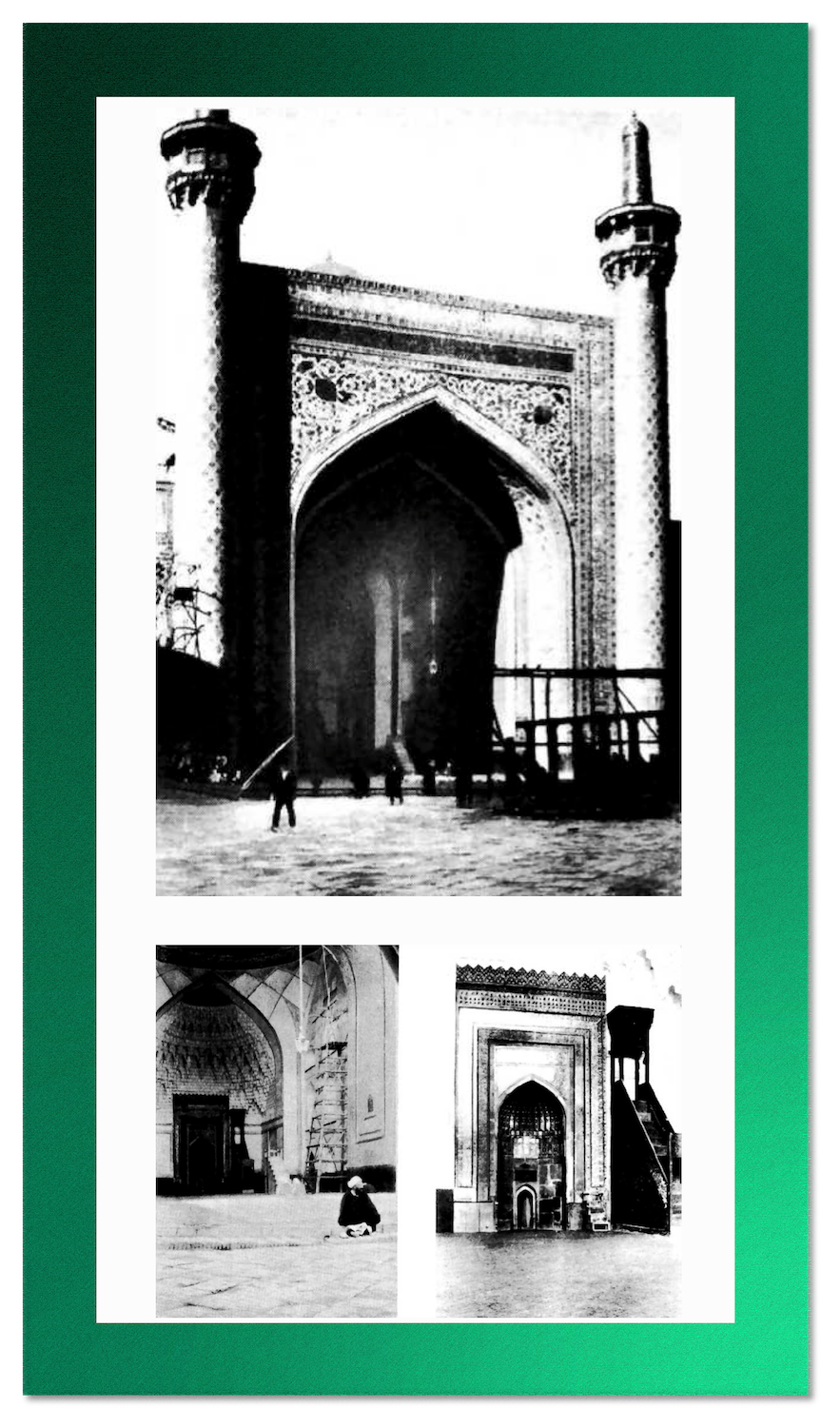 Views of the Mosque of Gawhar-Shád In Mashhád, showing the pulpit where Mullá Ḥusayn preached on a visit Mashhád three years prior. This is the city where Mullá Ḥusayn is when he receives the Báb’s green turban and the Black Standard. Source: Nabil, The Dawn-Breakers, page 124.