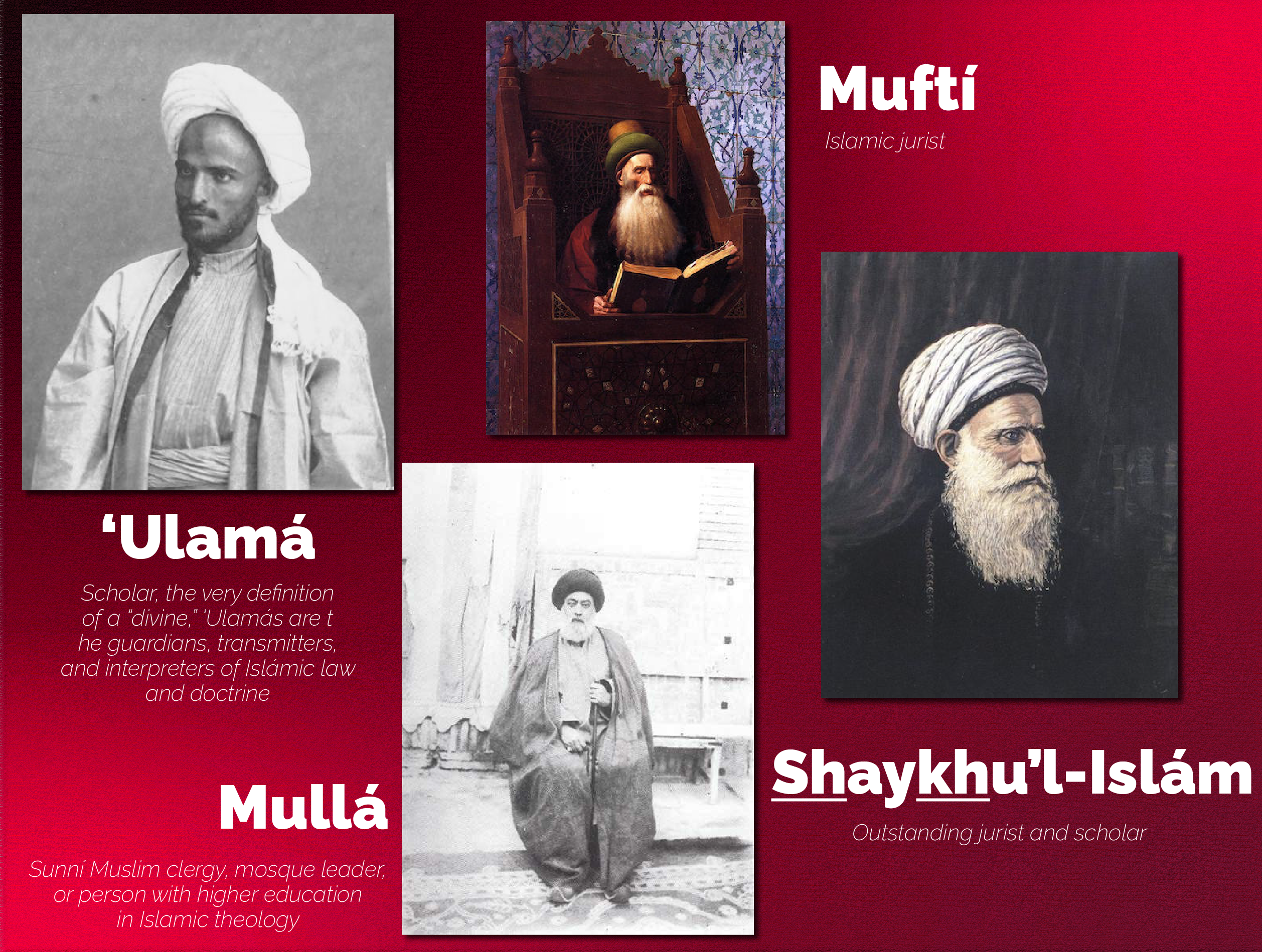 Collage of a variety of different Muslim clerics: a ‘ulamá, a mullá, a muftí, and a Shaykhu'l-Islám. © Violetta Zein